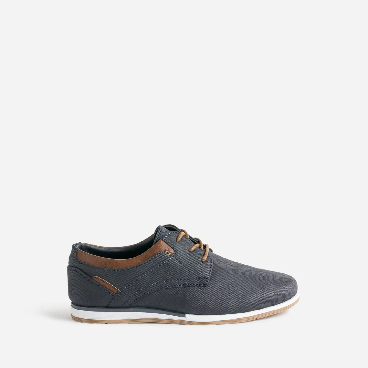 Matière synthétique rainurée, doublure textile chinée, détails marron, ce derby pour garçon s’invite dans le dressing d’été. Il séduit par une semelle tricolore légèrement compensée, pour plus de confort, et un style plus décontracté.