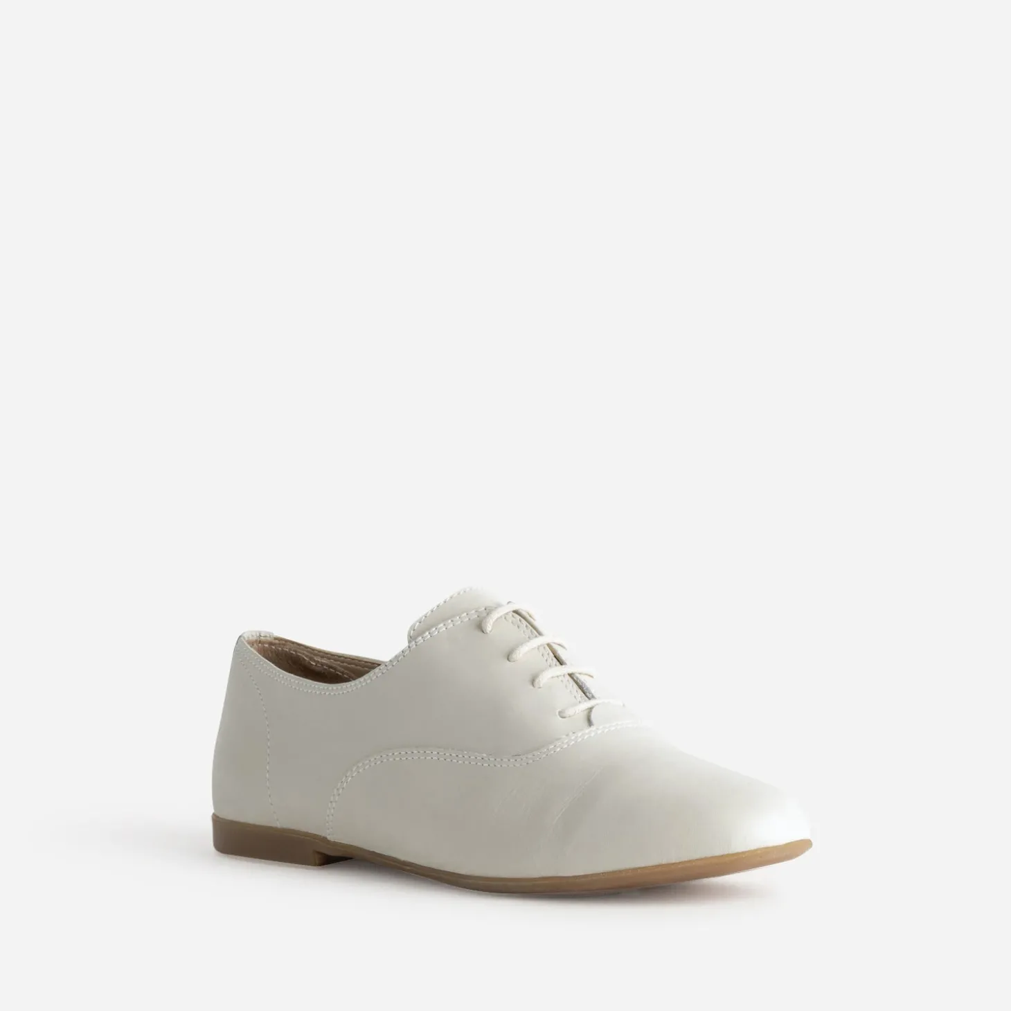 Emprunté au dressing masculin, le derby est toujours l’assurance d’un look élégant. En cuir écru, il se démarque par une finition mate et un lacet rond ton sur ton. Un modèle qui s’accommode aussi bien d’un tailleur-pantalon gris que d’une robe chemise noire à motif pois.