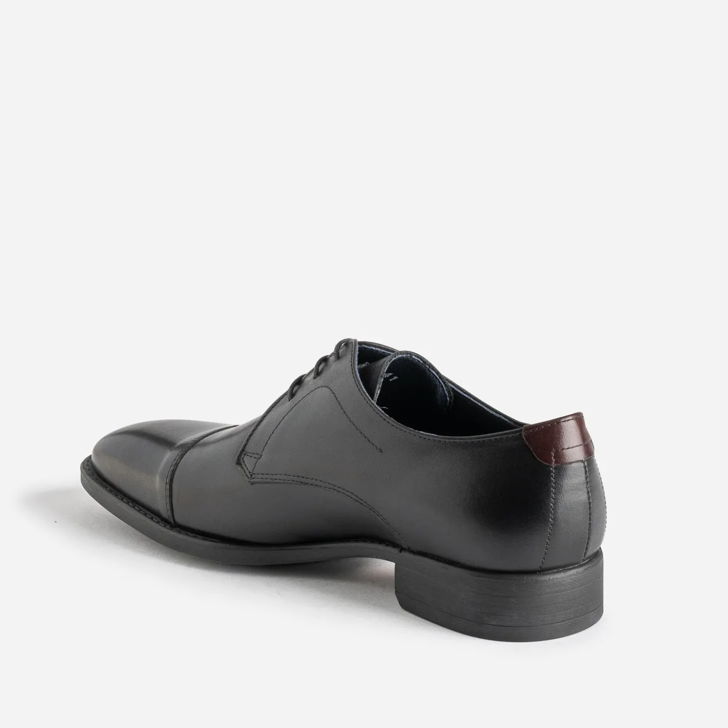 Coloris noir sur cuir lisse, le derby est le soulier le plus formel du shoesing homme. Empiècement marron sur le contrefort et doublure bleu marine, il mise sur les détails pour bousculer doucement son style. Associez-le avec un costume noir ou gris foncé.