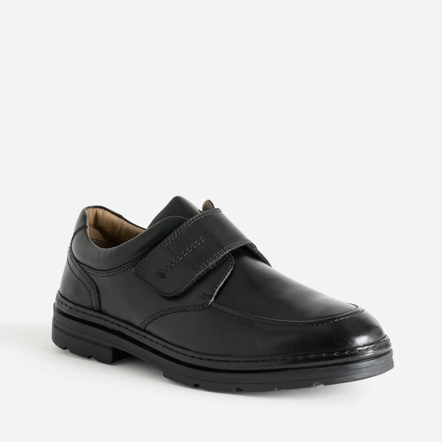 Le derby pour homme gagne en confort par : 1. sa matière, du cuir souple, sur le dessus et la semelle première. 2. Par sa fermeture par large scratch. Coloris noir, ce modèle est étudié pour être porté au quotidien.