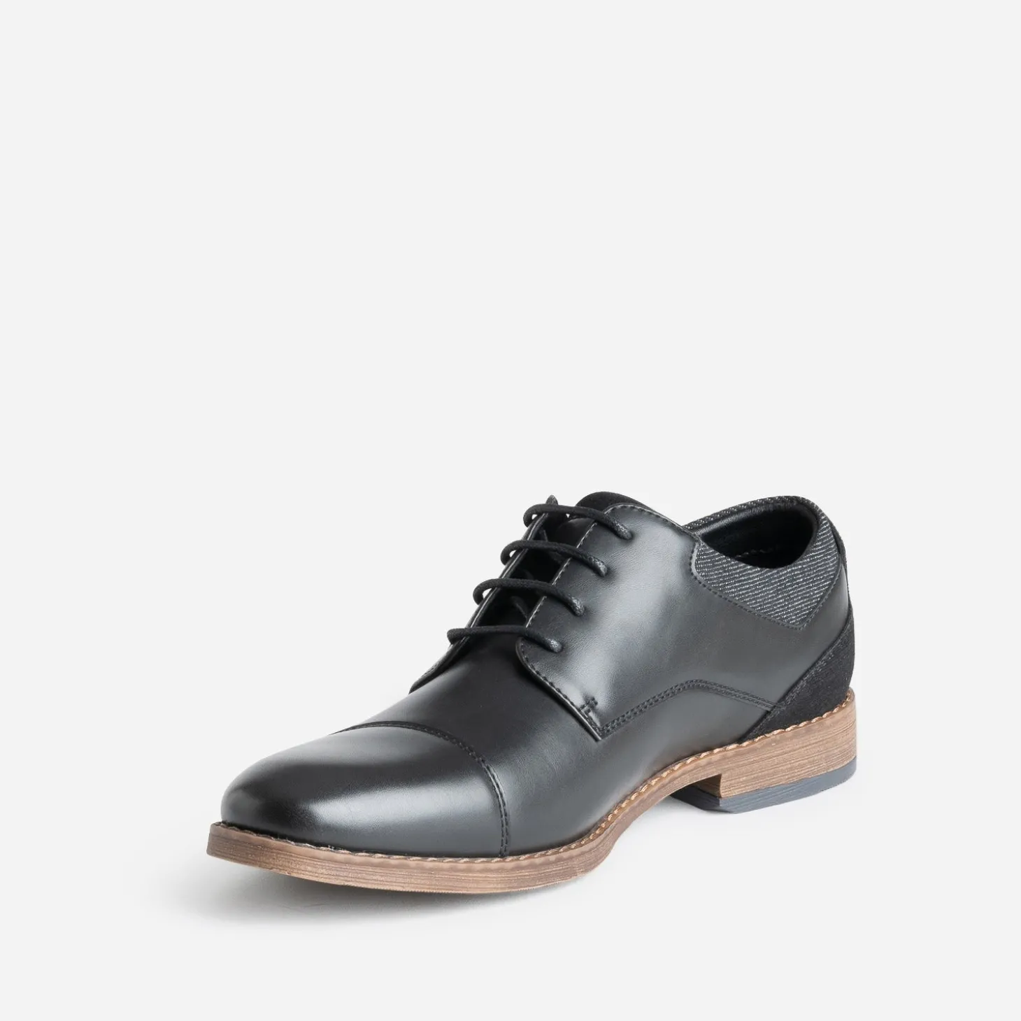 Le derby reste une valeur sûre et intemporelle du shoesing masculin. En matière synthétique noire, il opte pour une fantaisie maîtrisée, avec empiècement en denim sur le haut de la tige et en textile rainuré sur le contrefort. Il se démarque par un bout Molière, reconnaissable à la couture placée sur le bout du pied. Privilégiez-le avec un blazer, une chemise et un jean noir.