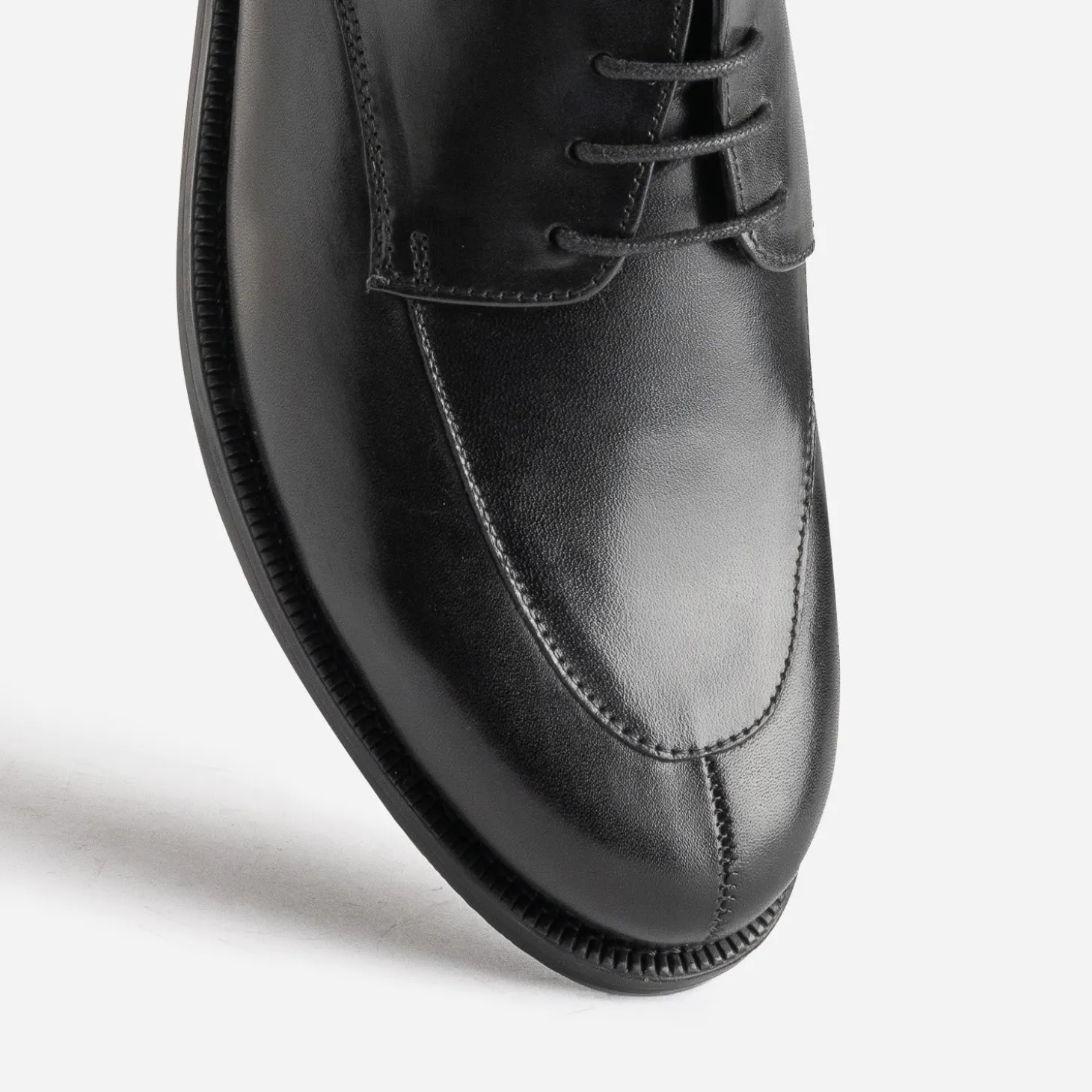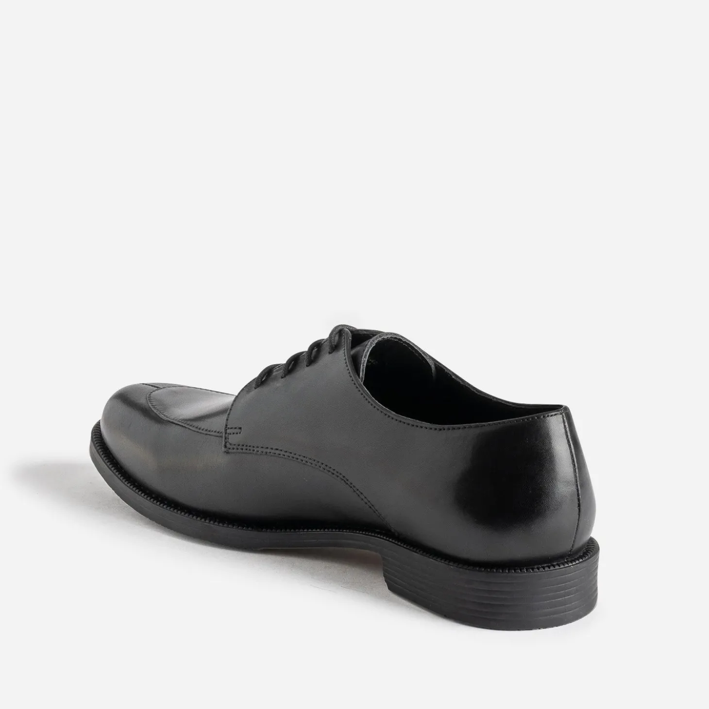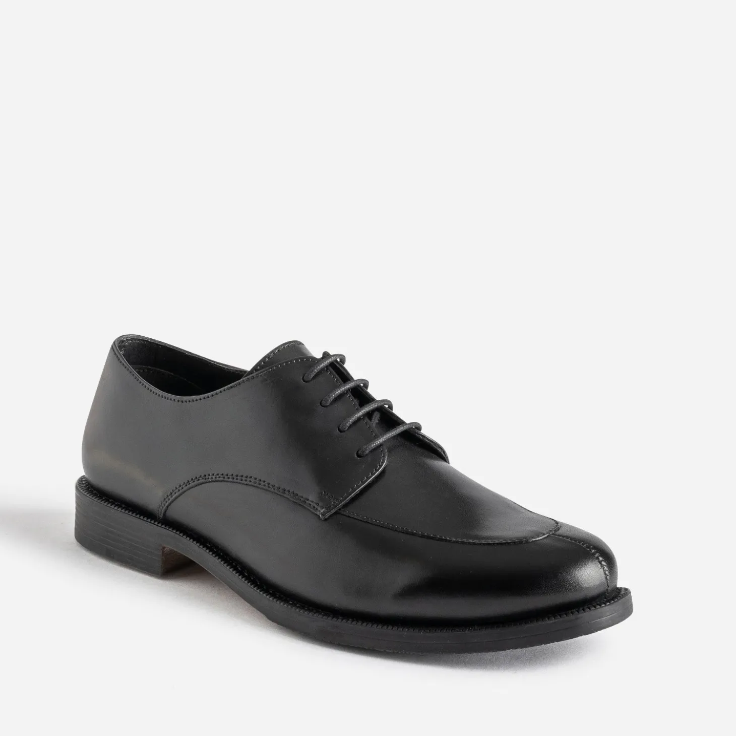 Marqué d’une découpe placée, ce derby homme défie les codes de la mode. En cuir noir, il s’adapte aussi bien à une tenue formelle qu’à une chemise à carreaux sur jeans avec bas roulotté, plus rock.