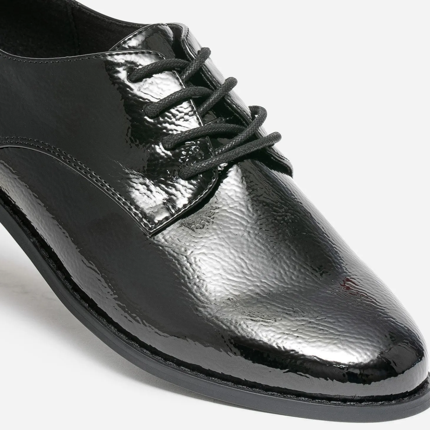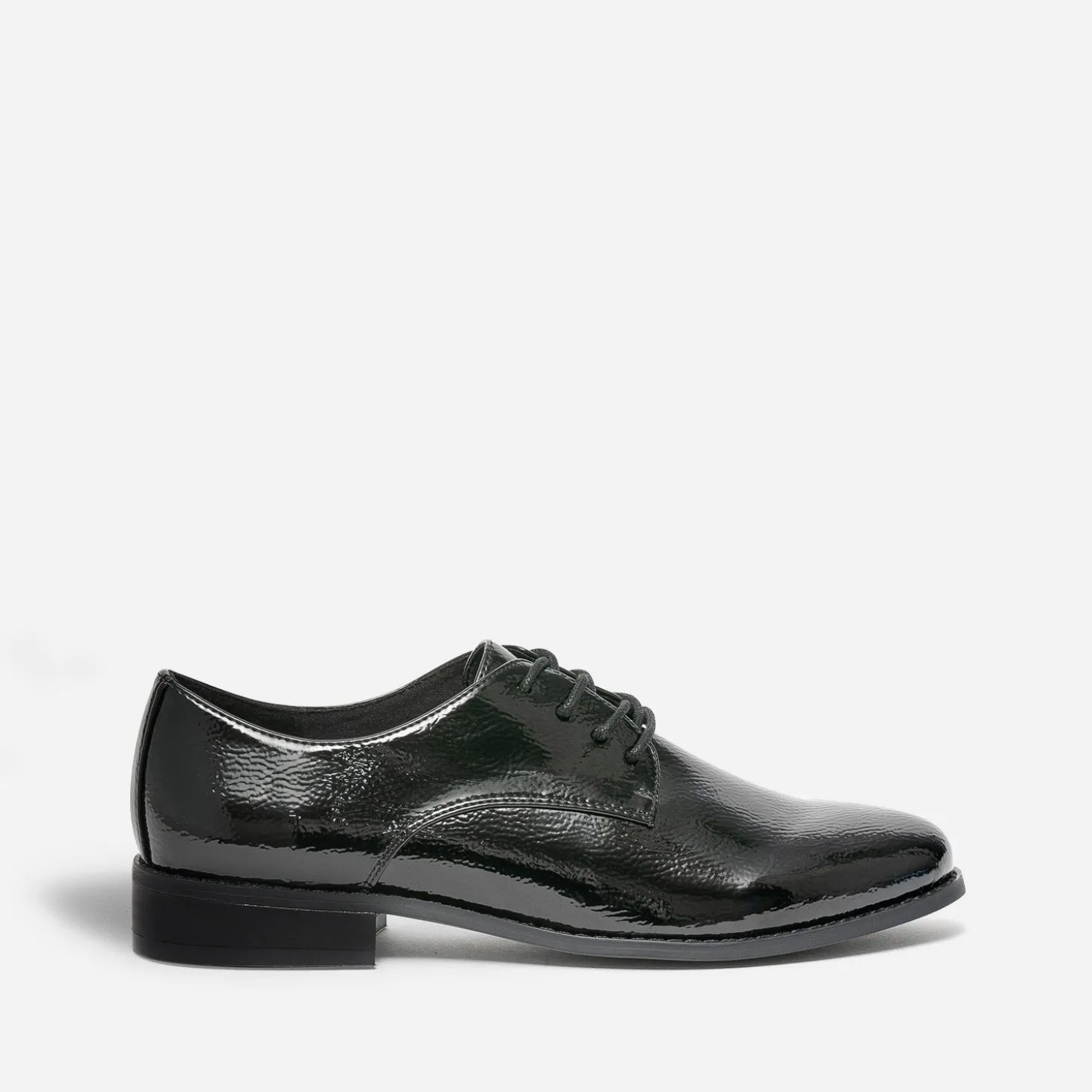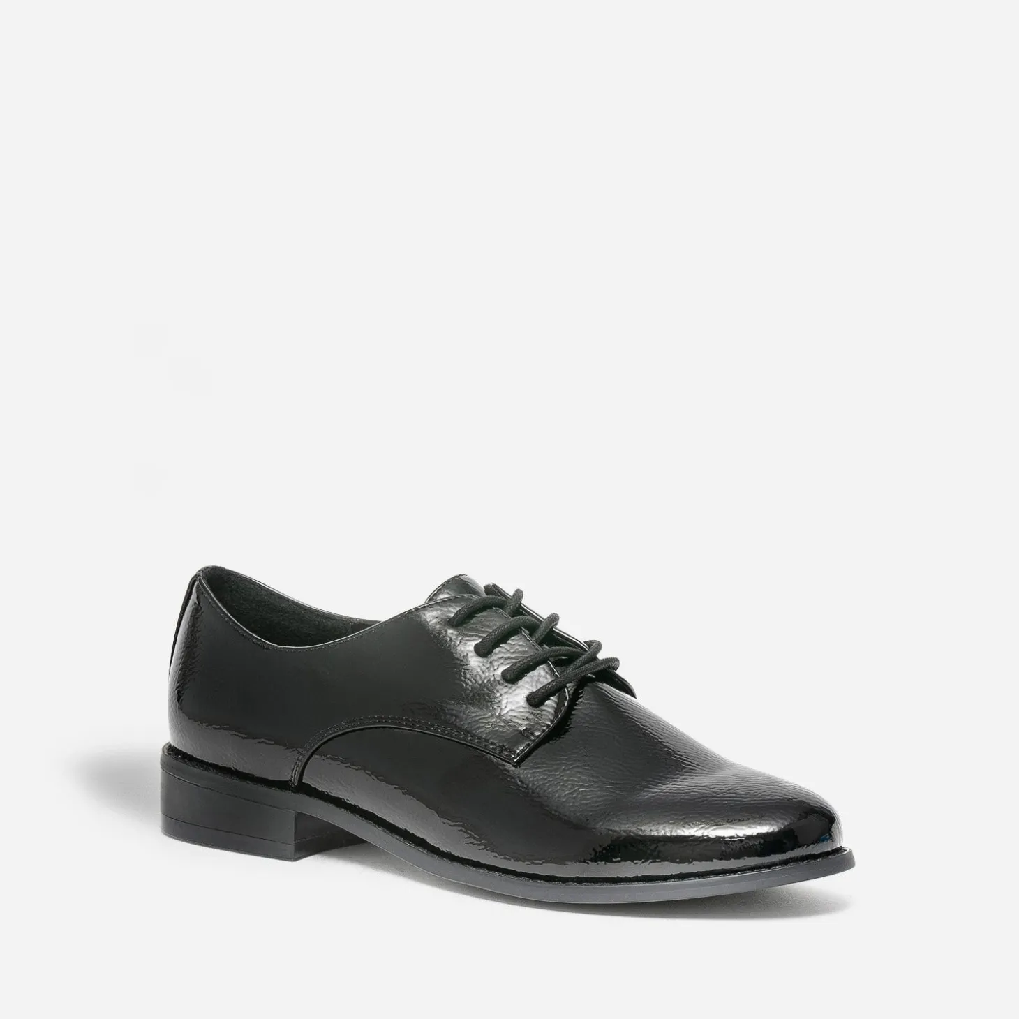 Emprunté au dressing masculin, le derby est toujours l’assurance d’un look élégant. En matière synthétique noire, il se démarque par une finition vernie et un lacet rond ton sur ton. Plat, il s’accommode aussi bien d’un tailleur-pantalon que d’une robe noire et des collants plumetis.