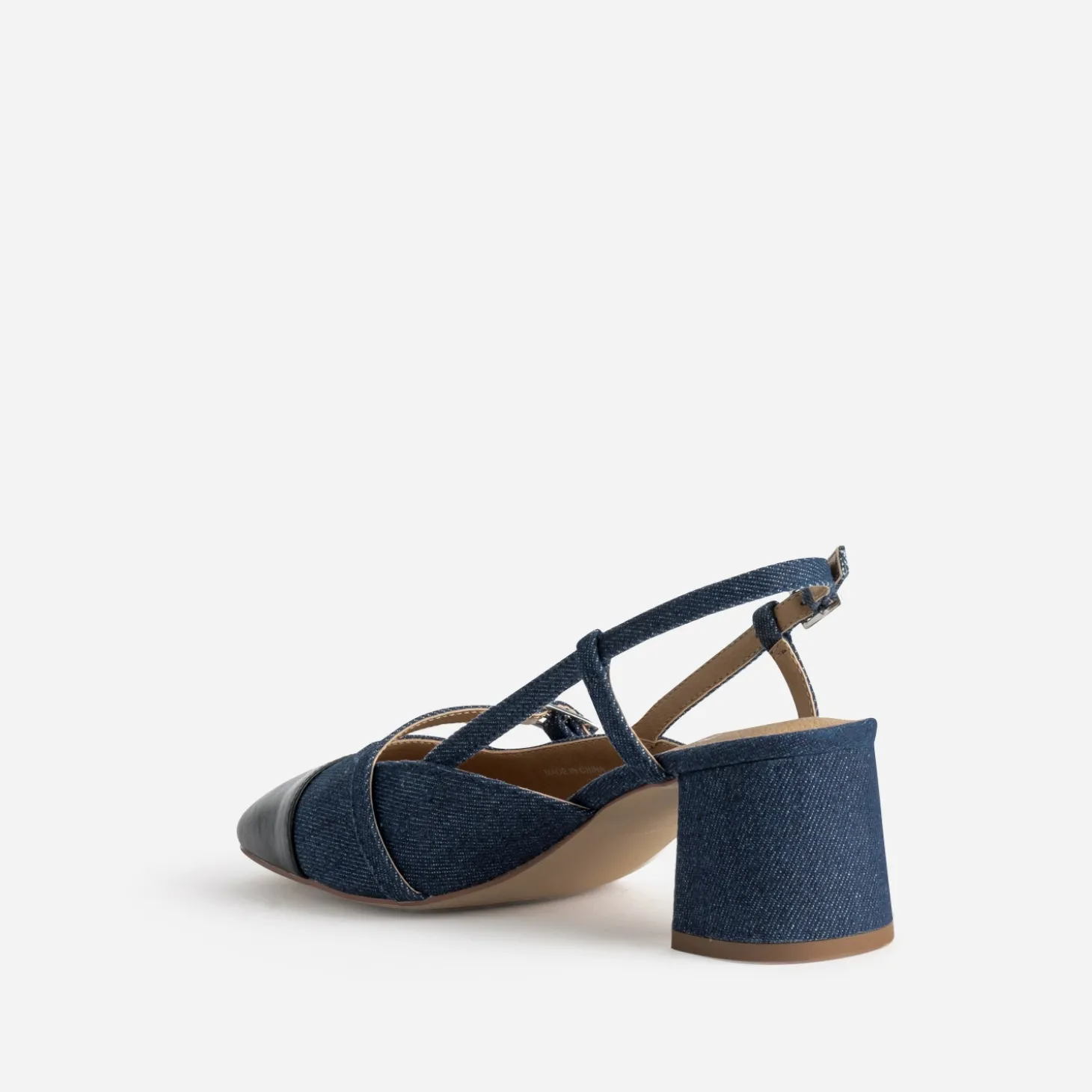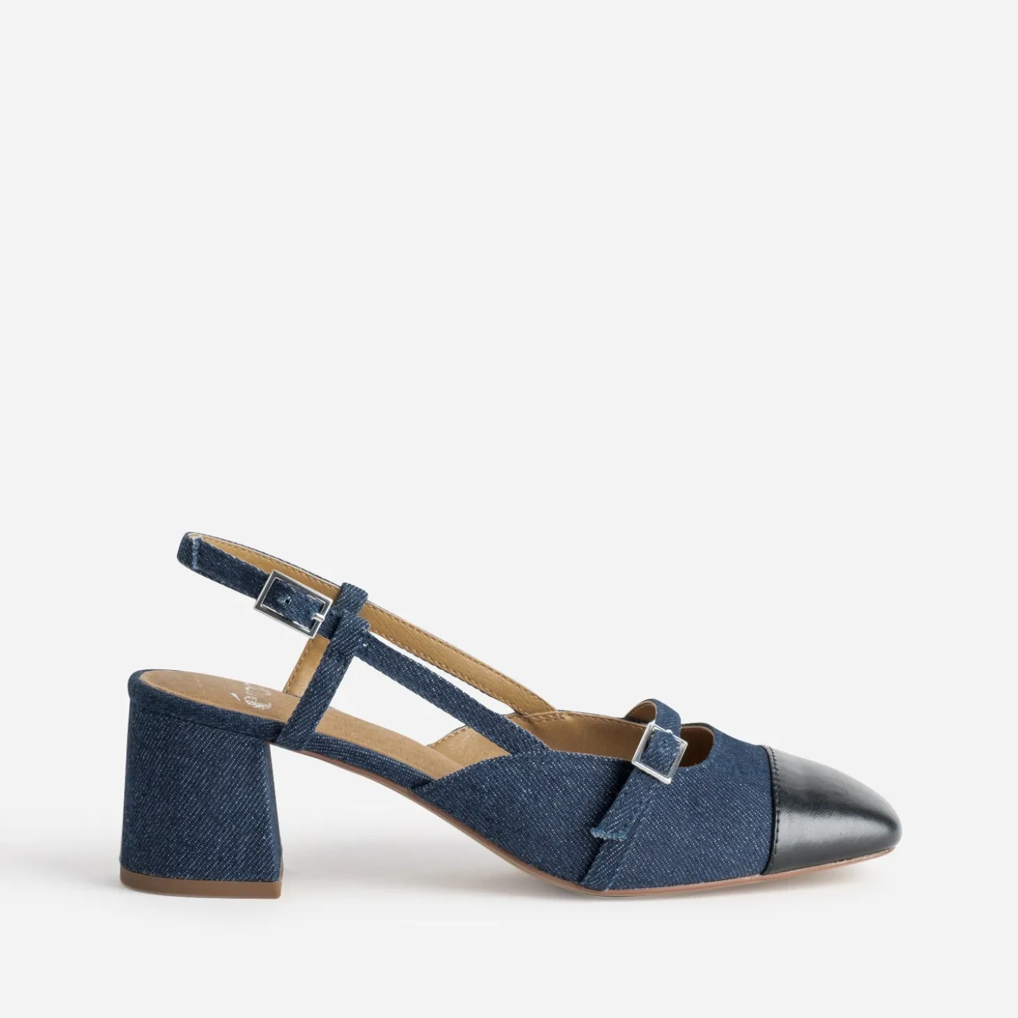 Ne passez pas à côté de la tendance rétro du moment. Elle s’illustre, sur cet escarpin pour femme, par un jeu de brides sur talon découvert appelé slingback. La toile denim brute recouvre tige et talon, et se finalise par un bout carré en matière synthétique lisse noire. Un modèle idéal pour l’inter-saison, avec un tee-shirt blanc à col rond, une veste de blazer noire et un jean bleu frangé.