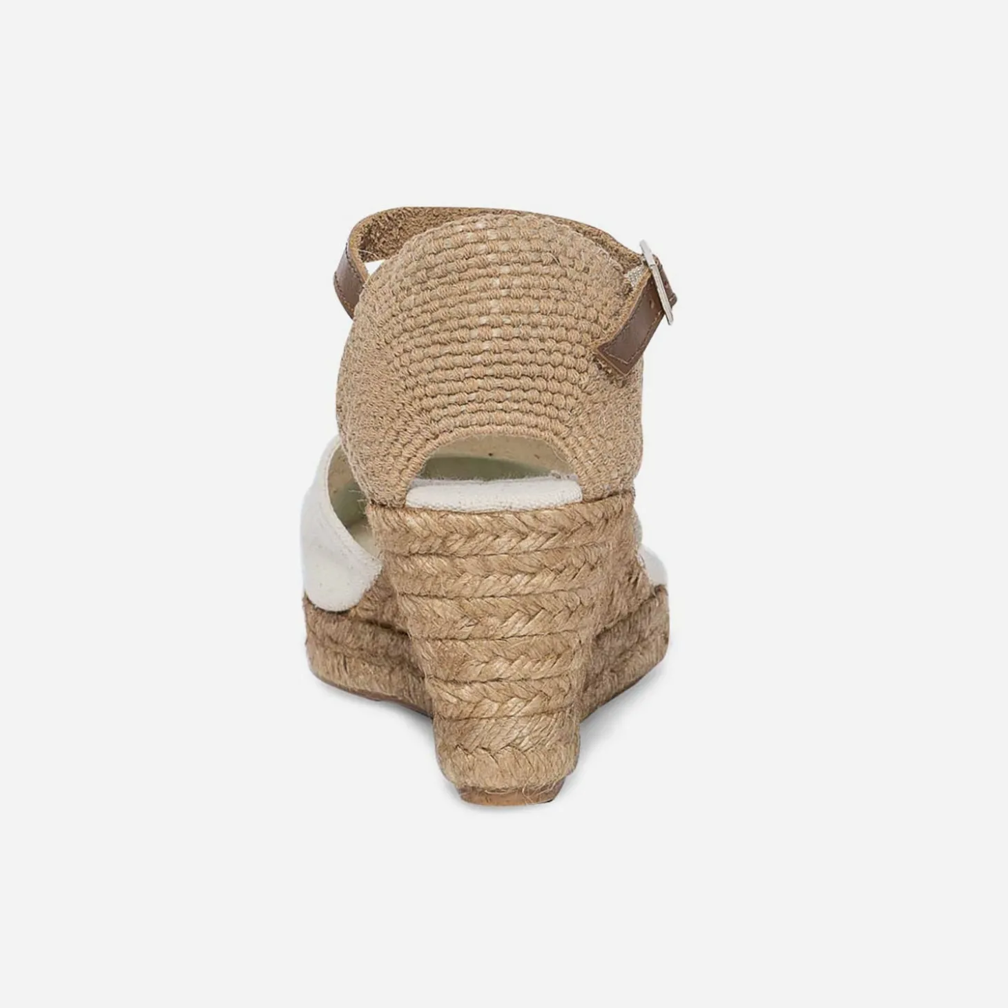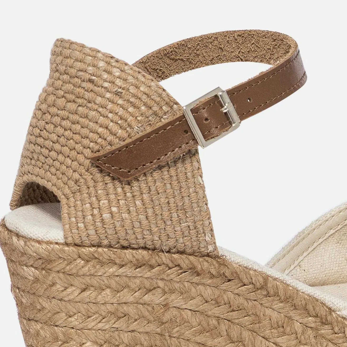 L’indémodable espadrille à talon compensé en corde reste la star de l’été ! En toile écrue sur le dessus, et jusqu’à la doublure et à la semelle première, elle présente une fine bride synthétique marron autour de la cheville. Adoptez-la sans modération avec un style casual au quotidien, au gré de vos envies. Fabriquée en Espagne