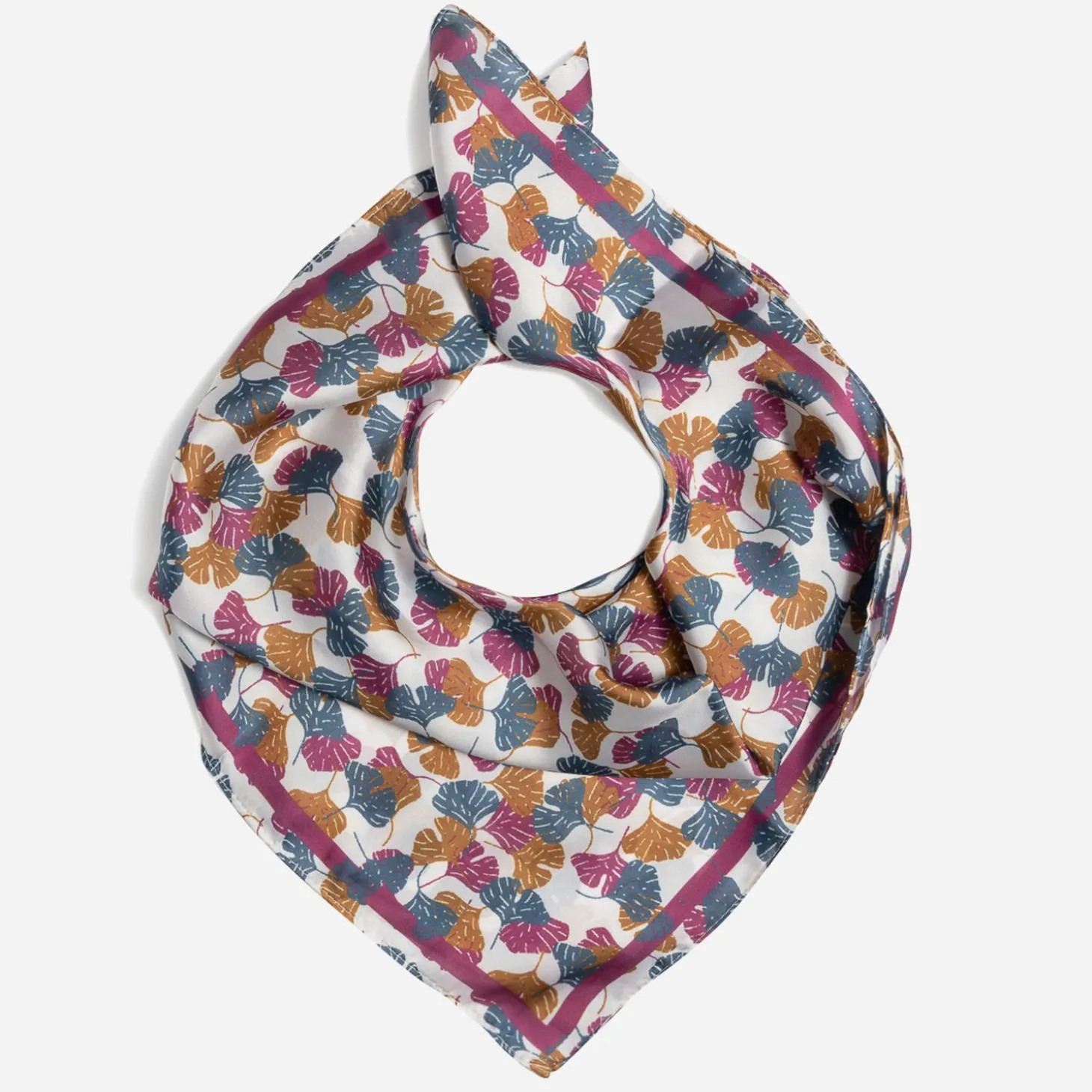 Bleues, camel et prune sur fond écru, les feuilles de ginkgo biloba animent ce foulard pour femme. Carré, il se noue autour du cou, dans les cheveux ou même sur l’anse d’un sac à main. A associer avec des pièces en denim bleu et des mocassins ou des sandales camel.