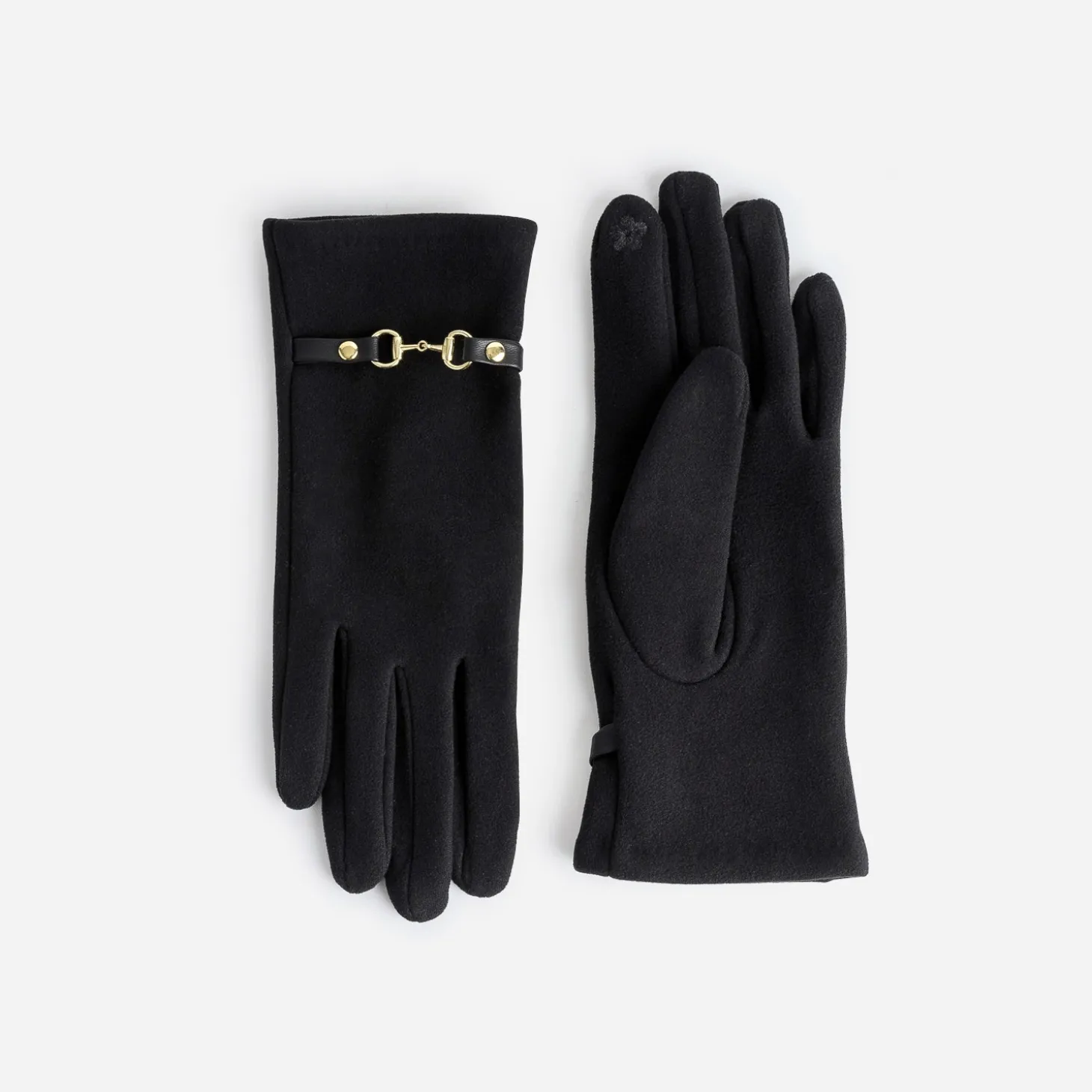 Décorés d’une patte inspirée du mors, habituellement sur les mocassin et placée ici sur le poignet, ces gants noirs pour femme gagnent en chic. En textile, ils possèdent une fleur brodée sur le dessous du pouce et de l’index, permettant d’utiliser le smartphone de façon tactile, sans les ôter.