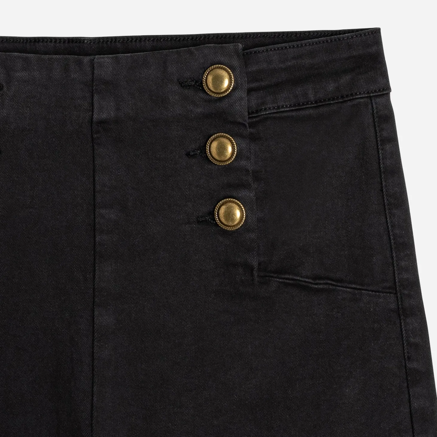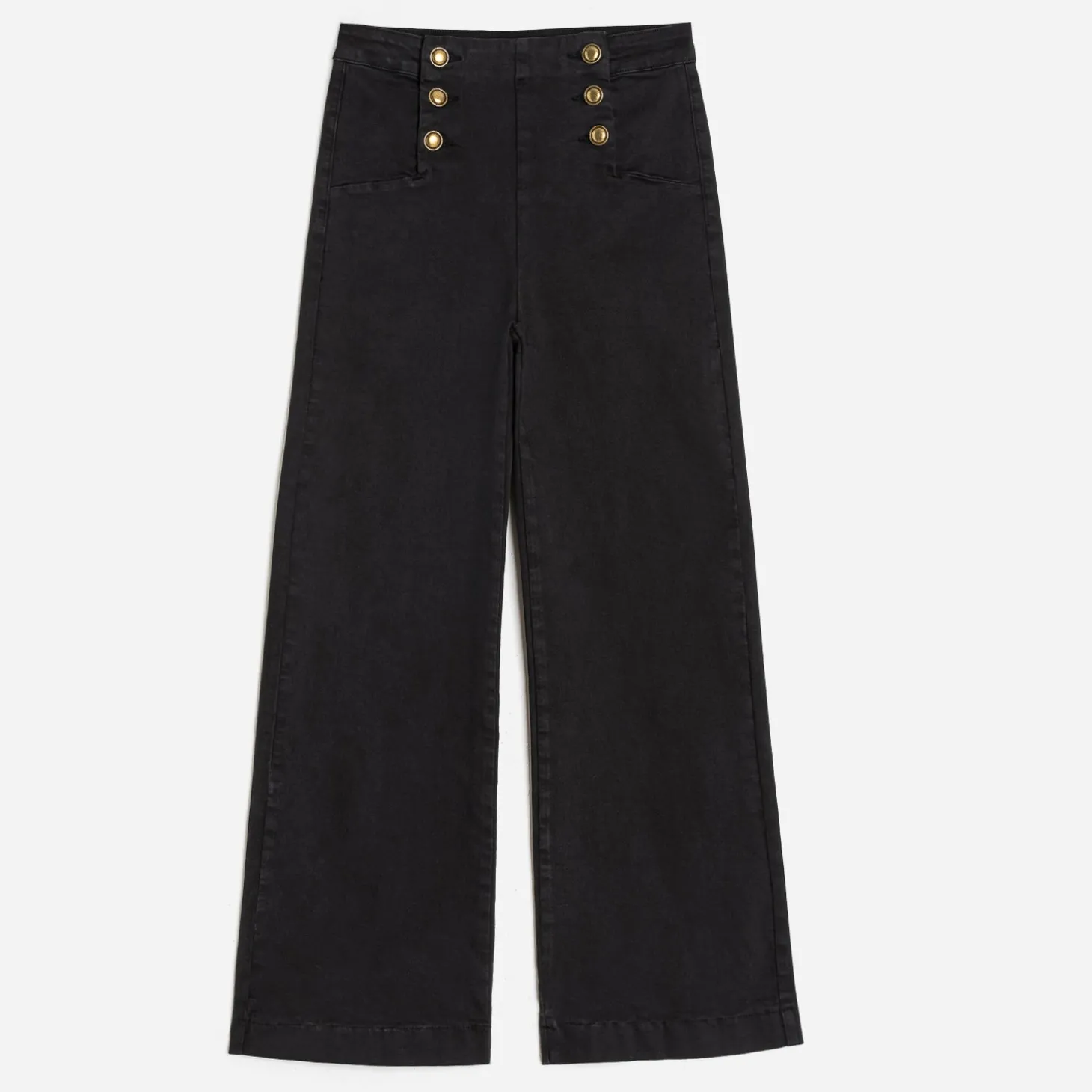 Le pantalon à pont n’a pas fini de faire parler de lui ! Imaginé en toile denim noire, il opte pour une taille haute, mise en valeur par une fermeture par double boutonnage et boutons en métal doré. Un must-have à assumer avec une marinière et une paire de boots à talon.