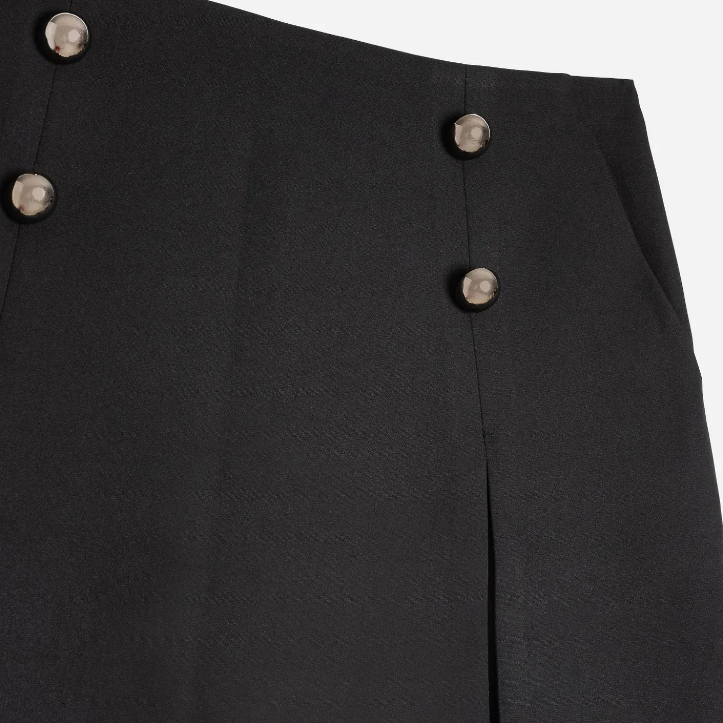 Coupe évasée, 2 poches côtés, plis creux devant, 4 boutons boule métal décoratifs, fermeture par zip invisible dos.