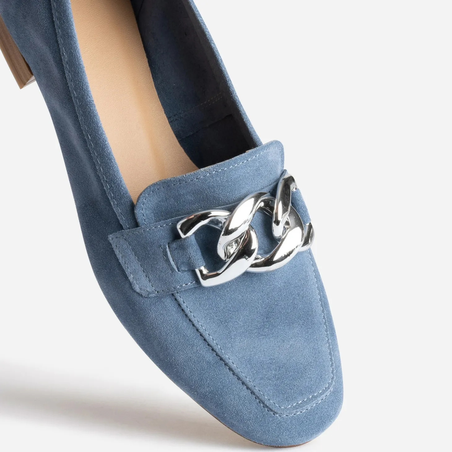 C’est une certitude : le mocassin pour femme est toujours à la pointe des tendance mode de la saison. En cuir velours lisse, il est non doublé, pour profiter d’une vraie souplesse, et se décline dans un sublime coloris bleu moyen. Sur le dessus, une maxi chaîne en métal argenté apporte une touche bcbg, à assumer avec une veste de costume bleu marine et un slim blanc ou à décaler avec un look monochrome.