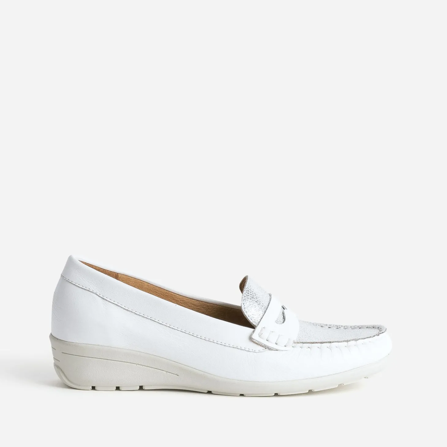 Le mocassin pour femme revendique un style masculin-féminin évident. Il gagne en confort, grâce à une semelle légèrement compensée et une semelle intérieure amovible, pour pouvoir placer celle parfaitement adaptée à votre plante de pied. Confectionné en cuir lisse, il joue le duo blanc et argenté, sublimé par un motif animalier sur le dessus. Préférez-le pied nu, avec un tailleur-pantalon blanc ou gris.