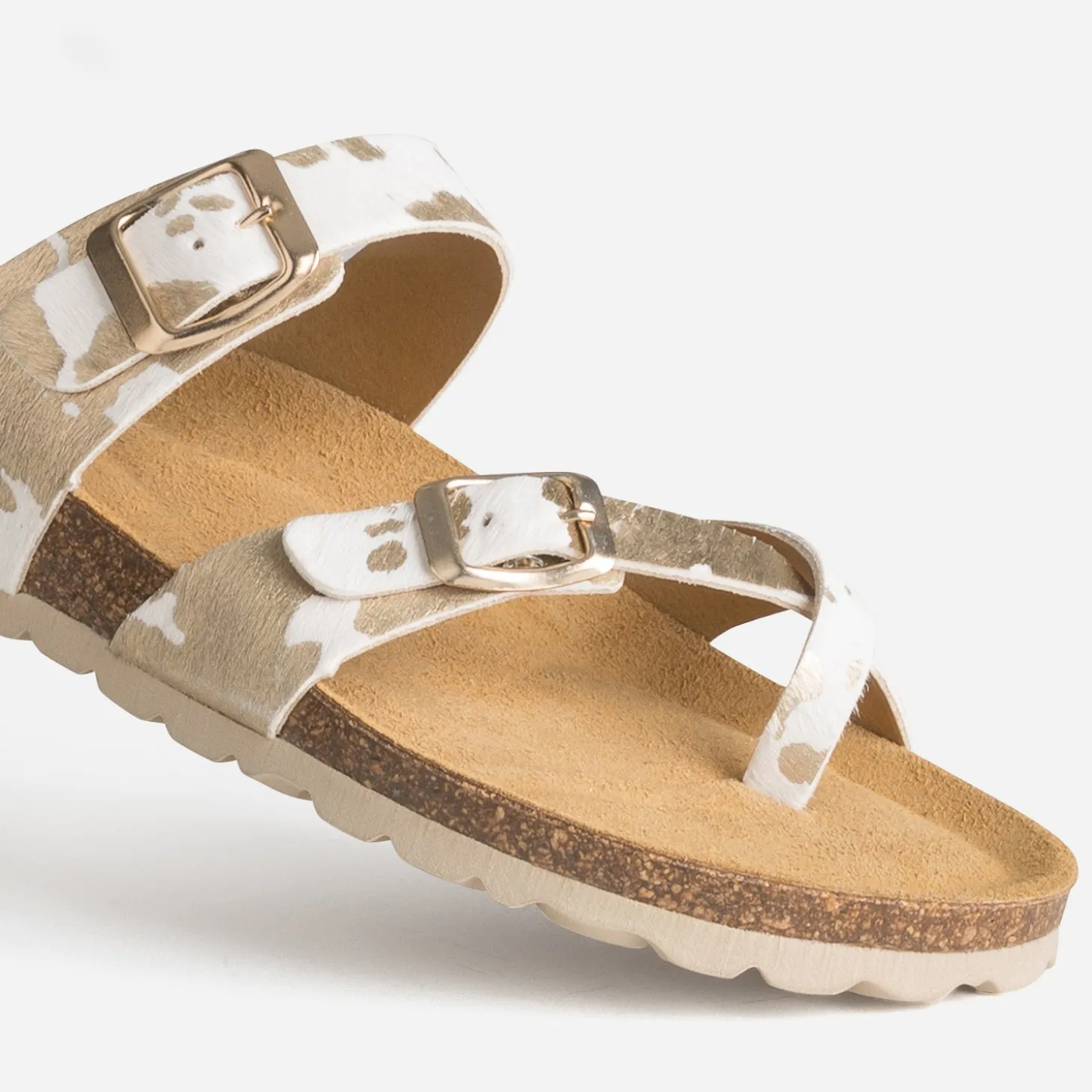 Adoptez un style audacieux avec cette mule pour femme. Semelle anatomique pour le confort, cuir effet poulain à motif vache, pile dans la tendance du moment, elle associe le blanc et le doré, dans une harmonie parfaitement étudiée. Le pied est bien maintenu par deux brides parallèles sur le dessus et une bride croisée sur le gros orteil. Un modèle pour attirer les regards, avec un petit gilet et une jupe-culotte en jean brut.