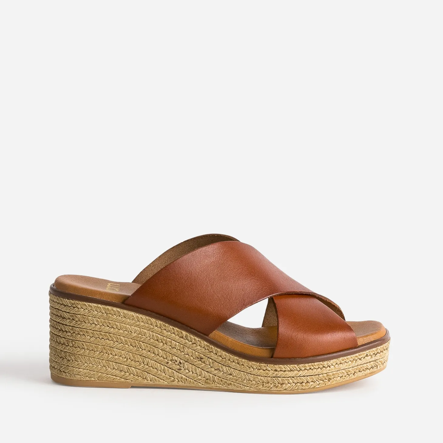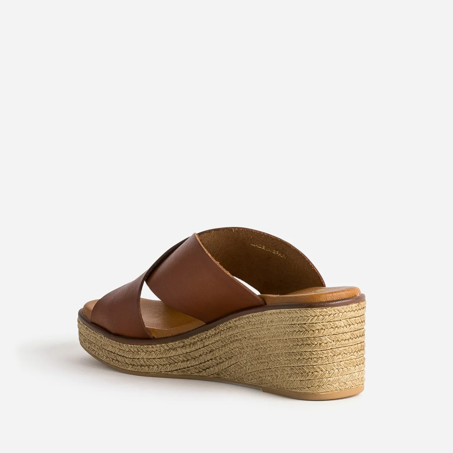 Ne vous fiez pas à son talon massif : cette mule prône la légèreté, pour vous accompagner tout au long de l’été. Montée sur un talon compensé imitation corde, elle s’ajuste au pied par deux larges brides en cuir. Son coloris, un rouge foncé presque brun, s’accorde à la perfection avec les marron.