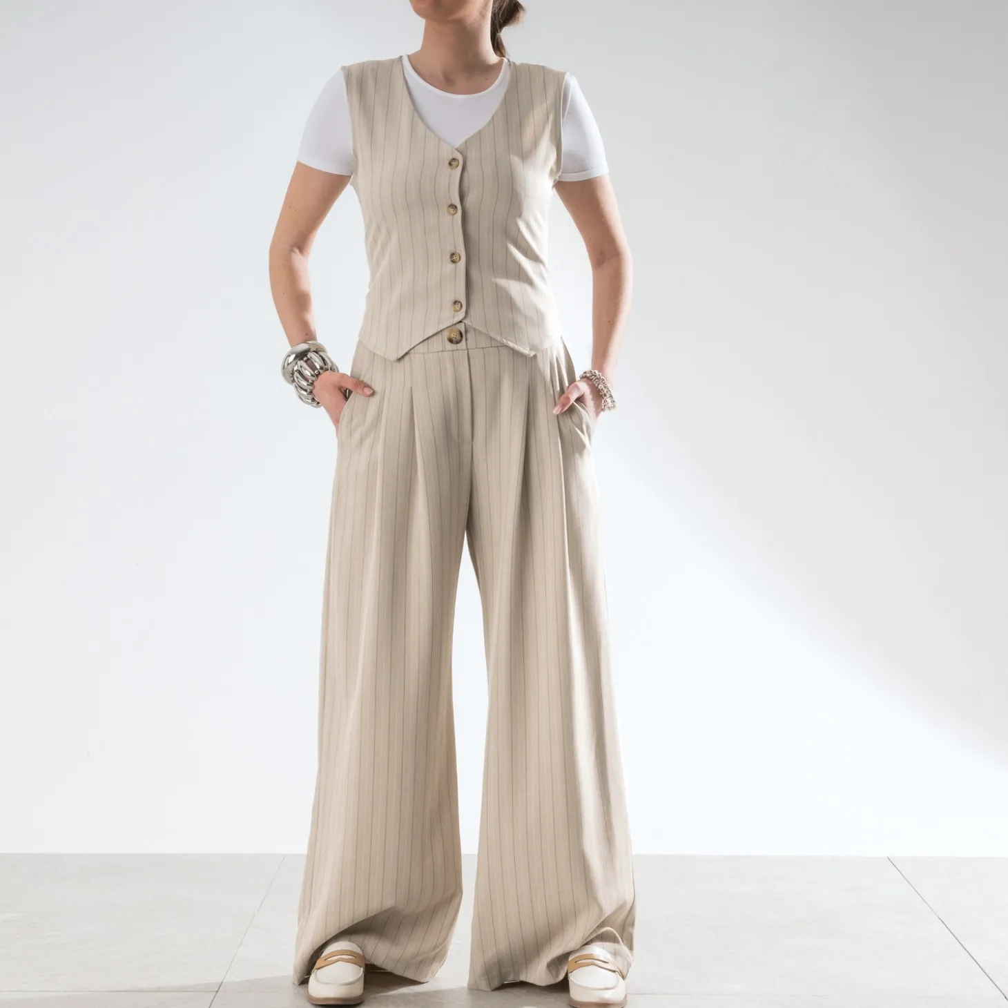 Le pantalon de tailleur, pièce emblématique du vestiaire masculin, connaît une véritable renaissance. Il s’affranchit de son image classique pour devenir un allié de choix dans nos looks de tous les jours. Coupe large au tombé impeccable, motif rayures tennis au style intemporel, il se décline en coloris beige. Un modèle versatile, facile à associer avec le gilet de costume assorti ou un tee-shirt blanc à col rond et manches courtes.