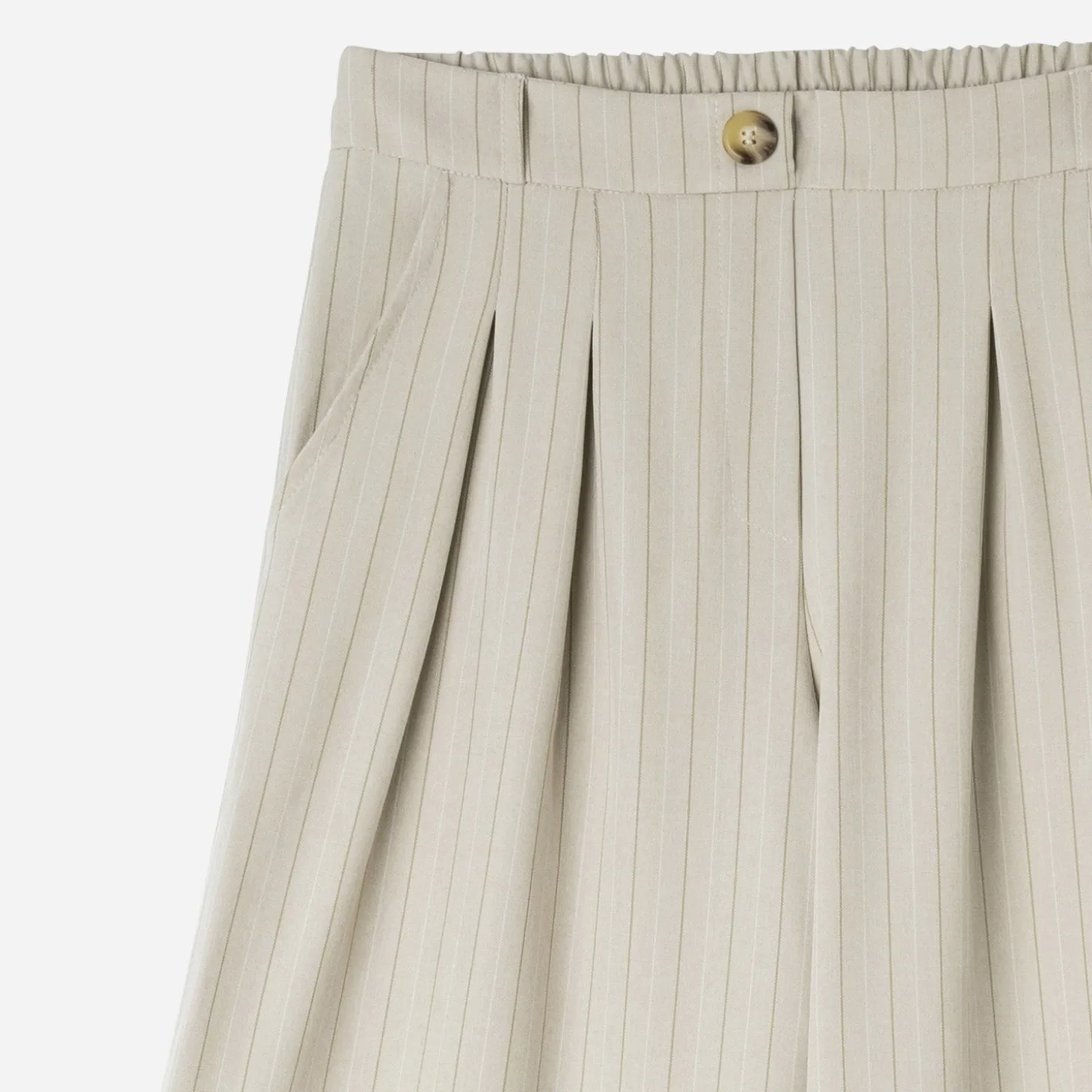 Volume large, 2 poches côtés, plis creux devant, motif rayures tennis, passants à la taille, taille élastiquée dos, décor bouton.