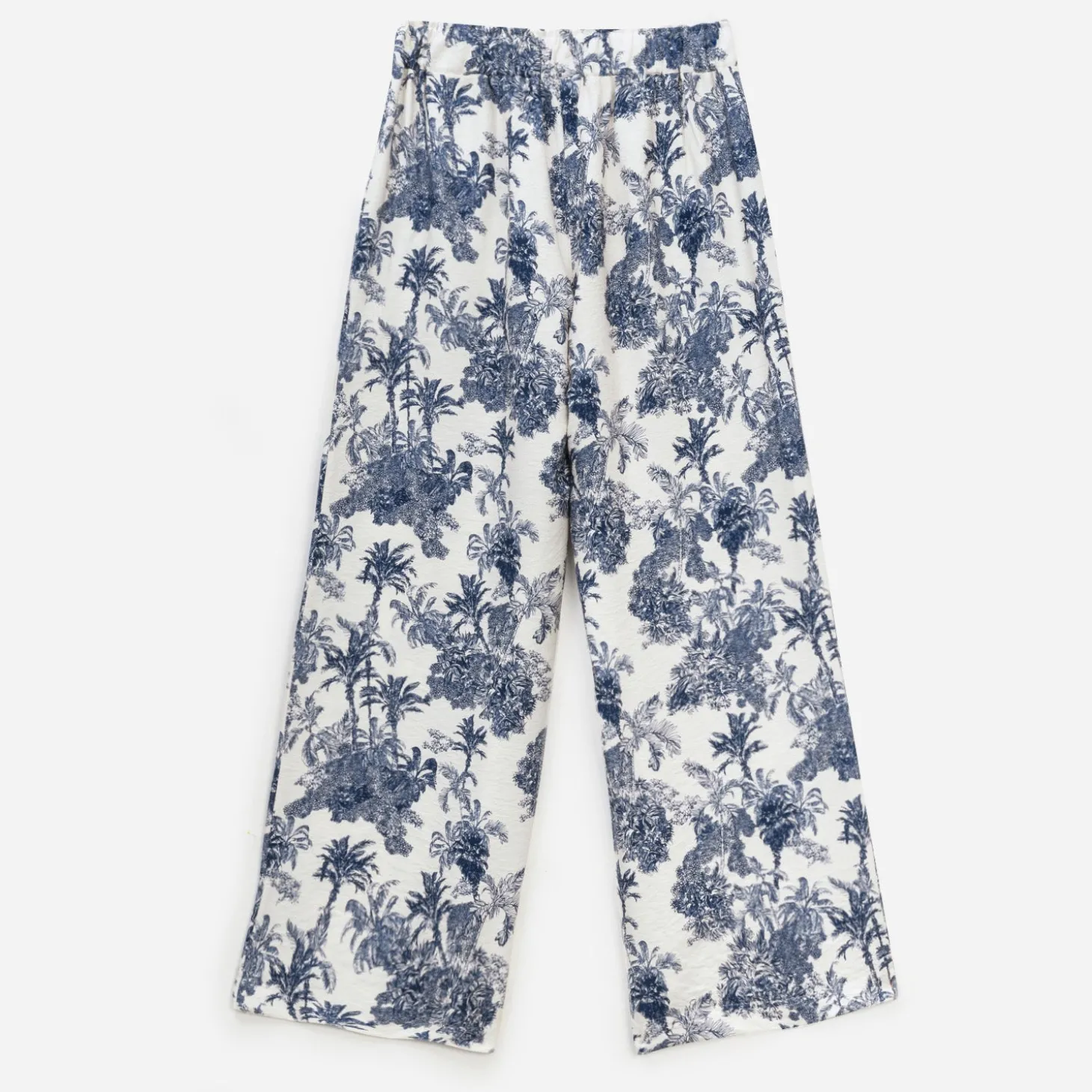Impossible de faire l’impasse sur le pantalon large, must-have de l’été. En textile fluide, il s’anime d’un imprimé palmiers façon toile de Jouy bleu sur fond écru.Ses alliés ? Un débardeur blanc côtelé, une veste en jean et des mules plates.