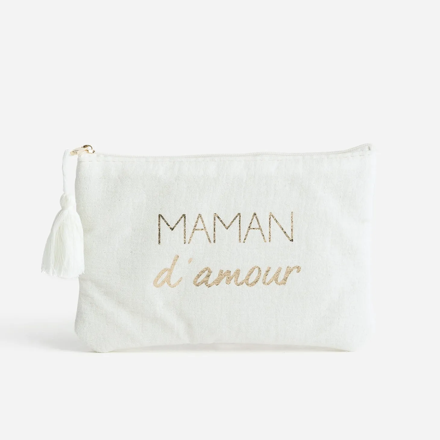 Comme son nom l’indique, ceci est une trousse pour ‘Maman d’amour’. En gaze de coton décorée d’un marquage sérigraphié doré, elle se décline en coloris écru et se ferme par un zip. Un accessoire à offrir pour la fête des mères ou pour son anniversaire !