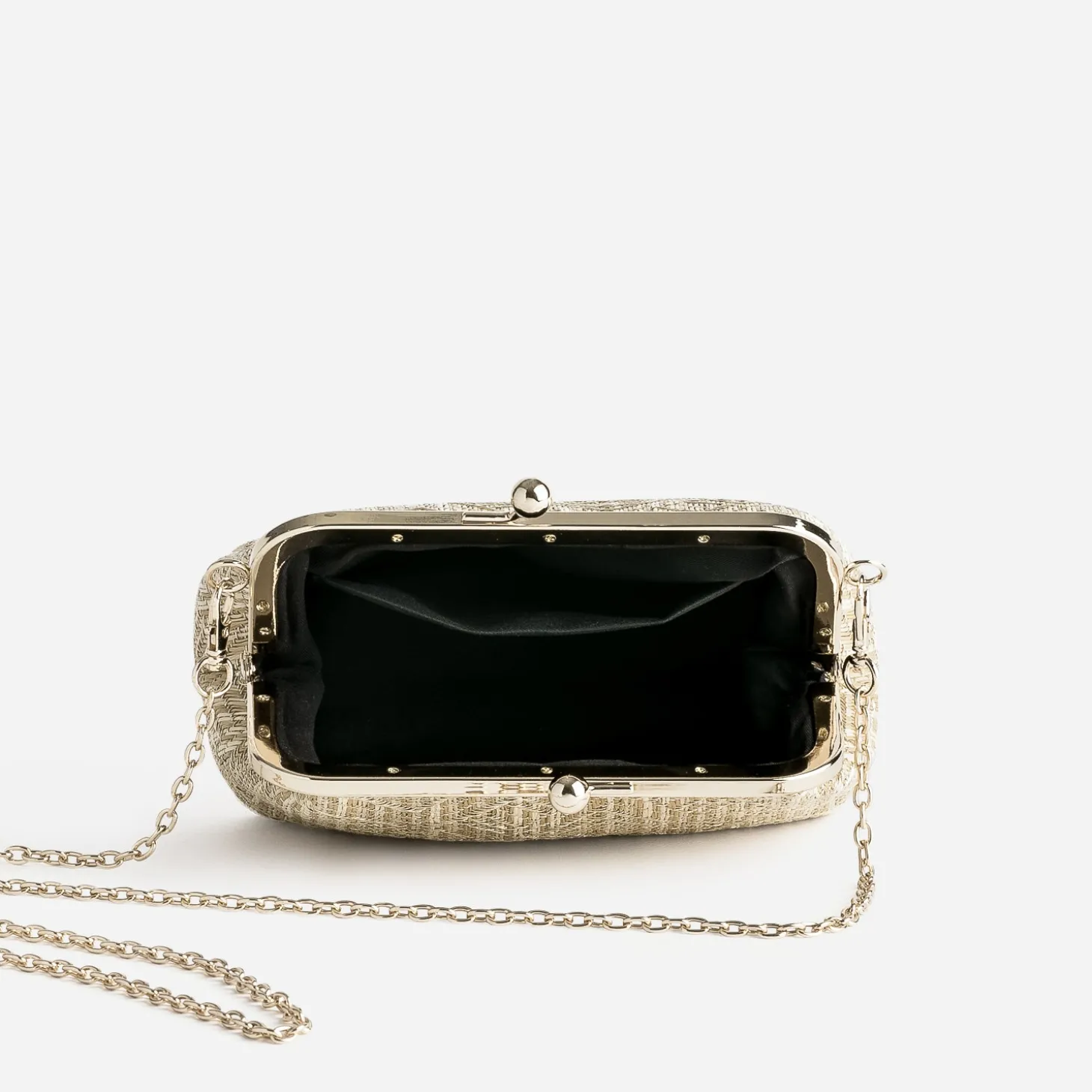 Dès réception d’une invitation, la quête de la tenue idéale prend le dessus. Suivie de près, par celle du sac à main. Inspiré par la forme d’un porte-monnaie, il présente une taille optimale pour n’accueillir que le principal. En matière synthétique beige, il se démarque par son tressage façon raphia, rebrodé de fils dorés et par sa bandoulière-chaînette amovible, pour un porté à la main, sur l’épaule ou croisé. Un modèle plutôt estival, qui fera son petit effet aux prochaines cérémonies et autres évènements de votre vie.