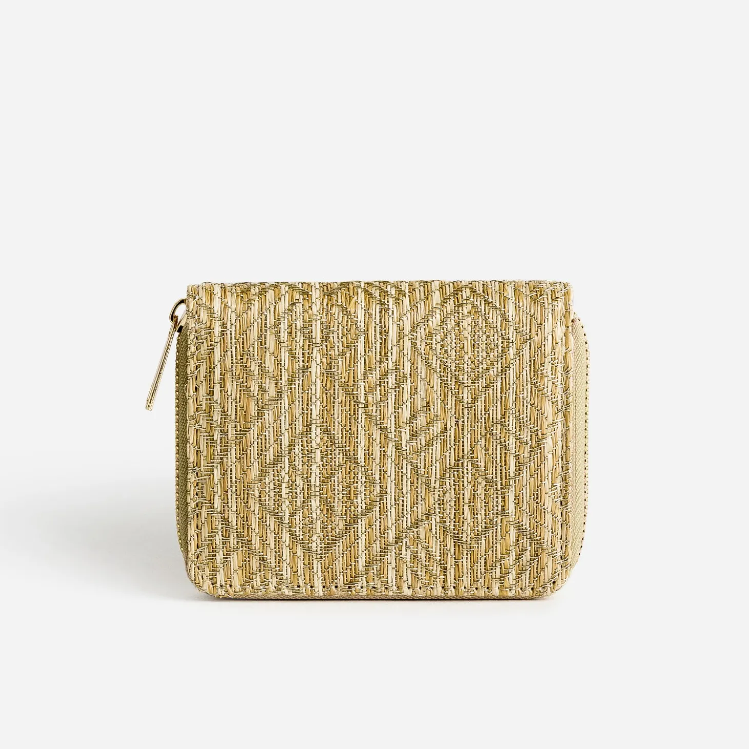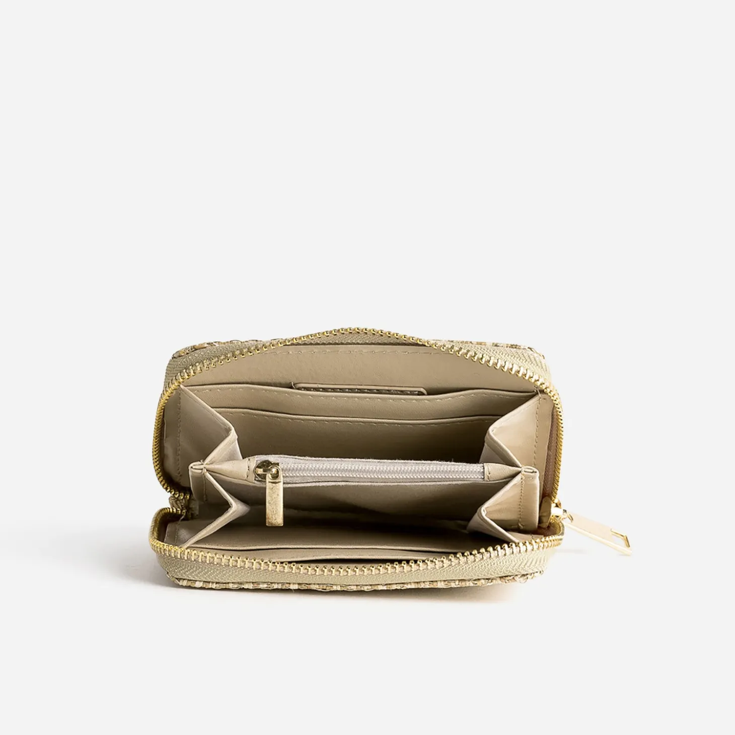 Matière papier beige avec broderie dorée, ce porte-monnaie bouscule les codes, en s’appropriant la tendance bohème chic. A l’intérieur, une poche zippée accueille les pièces et les 4 fentes, les cartes de crédit, de fidélité, de transport. Un accessoire indispensable, à glisser dans son sac du moment.