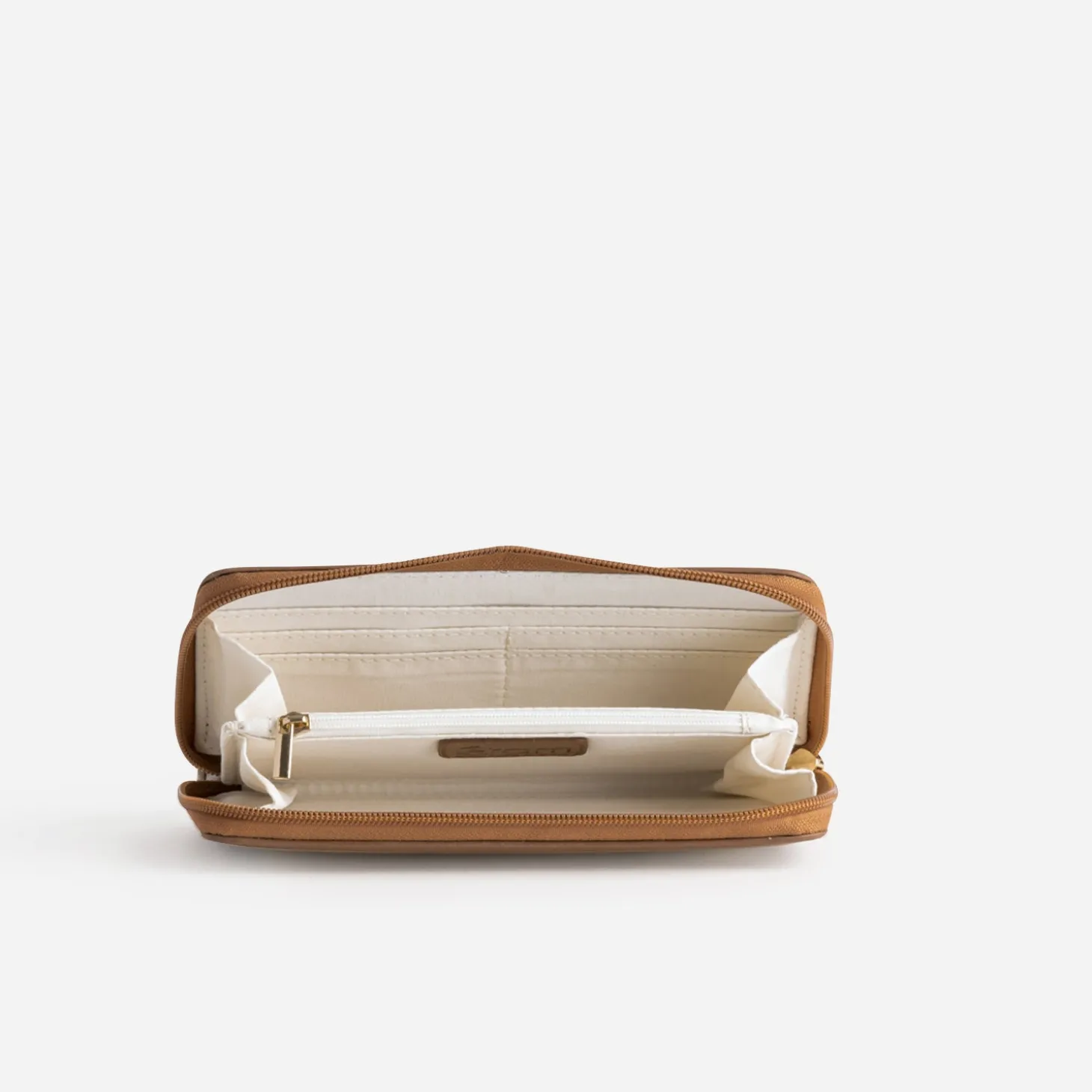 Petit plaisir du jour : sortir un beau portefeuille, pour régler la note ! Mix matière, il associe un textile beige à une matière synthétique lisse camel, dans un combo remarquable. A l’intérieur, vous pourriez y ranger cartes et billets, monnaie et papiers, grâce aux différents compartiments prévus à cet effet. Un accessoire de maroquinerie à mettre entre toutes les mains !