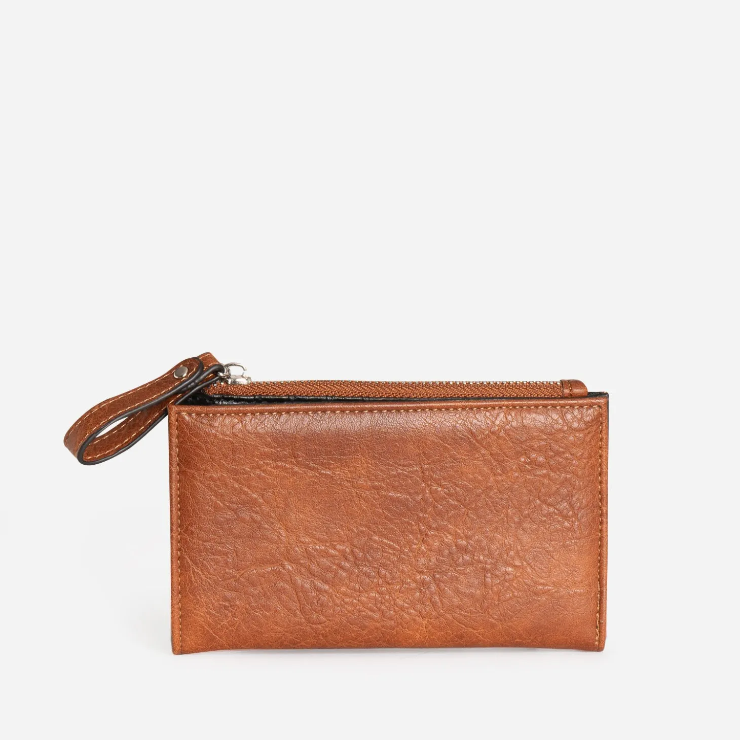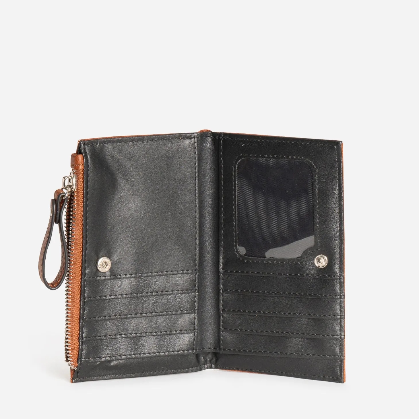 Ce portefeuille séduit par sa forme plate, facile à glisser dans la poche interne d’une veste ou la poche arrière d’un pantalon. En matière synthétique camel, il comporte un compartiment zippé pour la monnaie, et s’ouvre, grâce à une pression, sur huit fentes pour cartes, un compartiment pour billet et deux compartiments.