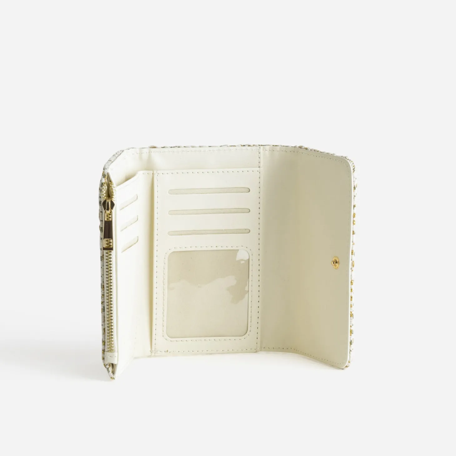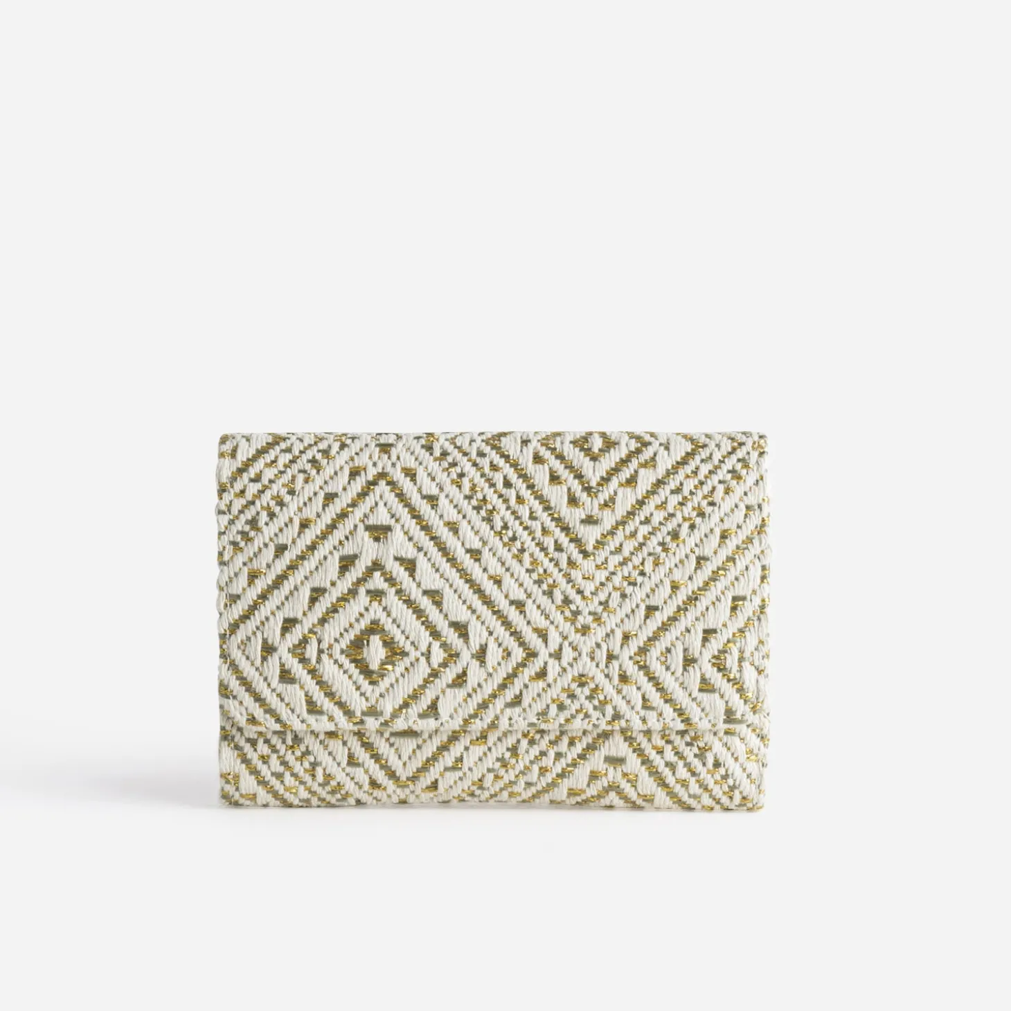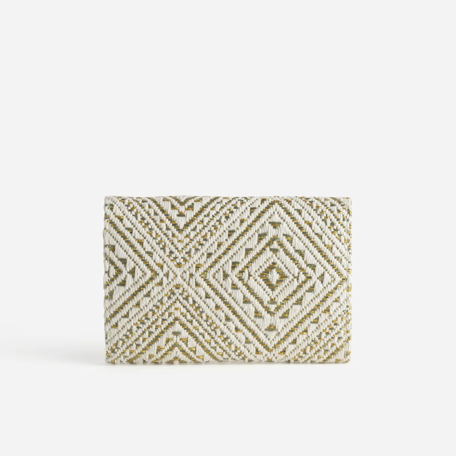 Ouverture en triptyque pour ce portefeuille écru. En textile, il présente un tressage avec fils kaki et métalliques dorés. Il s’ouvre sur 6 fentes pour cartes, 1 comportement à billets, 2 ouvertures intérieures et, sur le côté, 1 poche zippée pour la monnaie. Il se ferme par une pression cachée sous le rabat. Un accessoire de petite maroquinerie, à glisser dans son sac à main, pour avoir tous vos papiers personnels à portée de main.