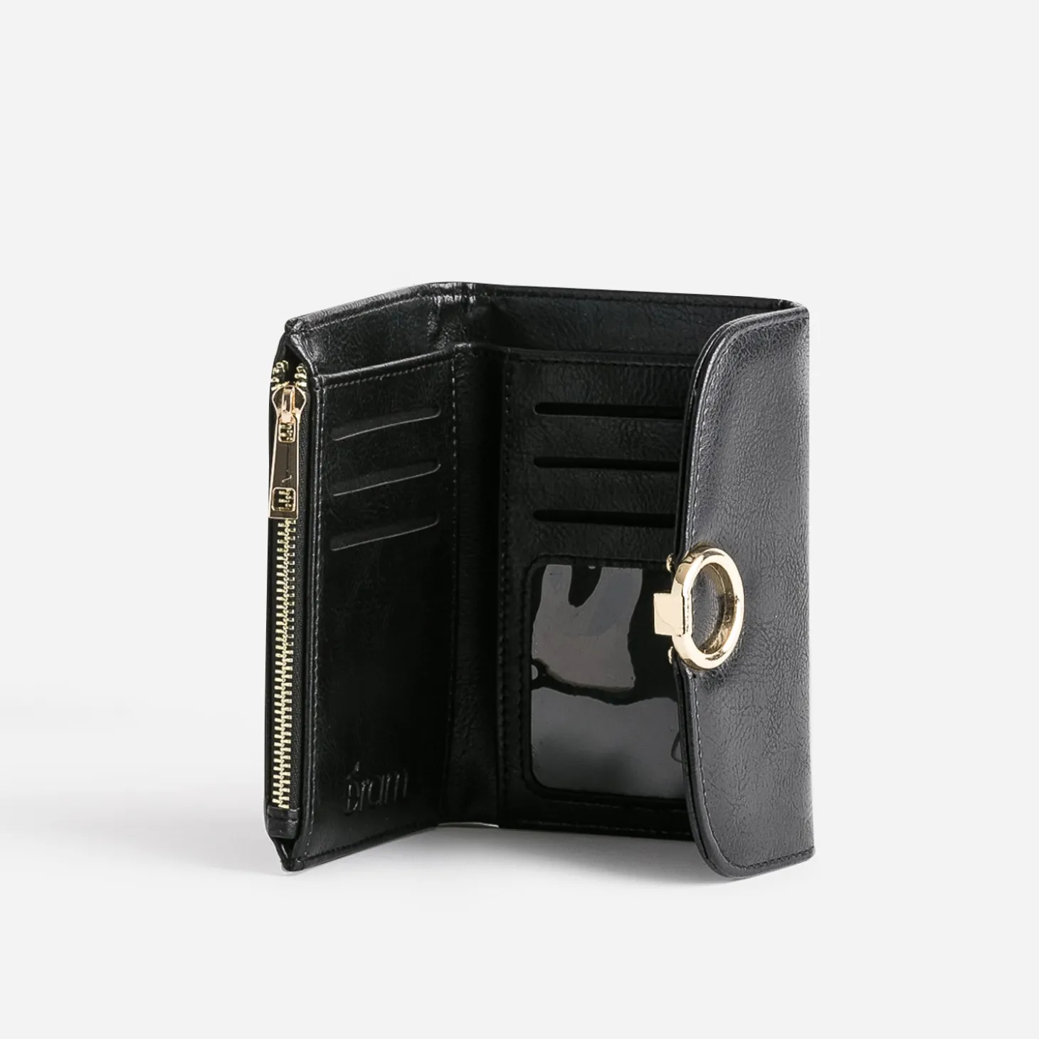 Ni trop grand, ni trop petit, ce portefeuille se glisse facilement dans votre sac à main. En matière synthétique lisse, il affirme son chic par un coloris noir, sobre et intemporel, un anneau en métal doré, posé sur le rabat. A l’intérieur, compartiment zippé, compartiment à billets, compartiments à papiers, fentes pour cartes : tout est pensé pour optimiser le rangement, en toute sécurité.