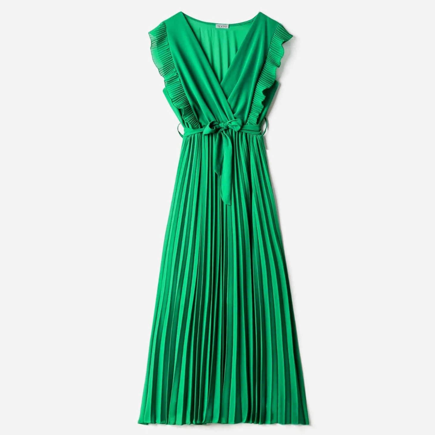 La robe longue reste la pièce des cérémonies et de tous les moments d’exception, où l’élégance est de mise. Déclinée en coloris vert, elle s’autorise des jeux de plissé étudiés. Un modèle à porter avec ou sans ceinture, avec ou sans talon.