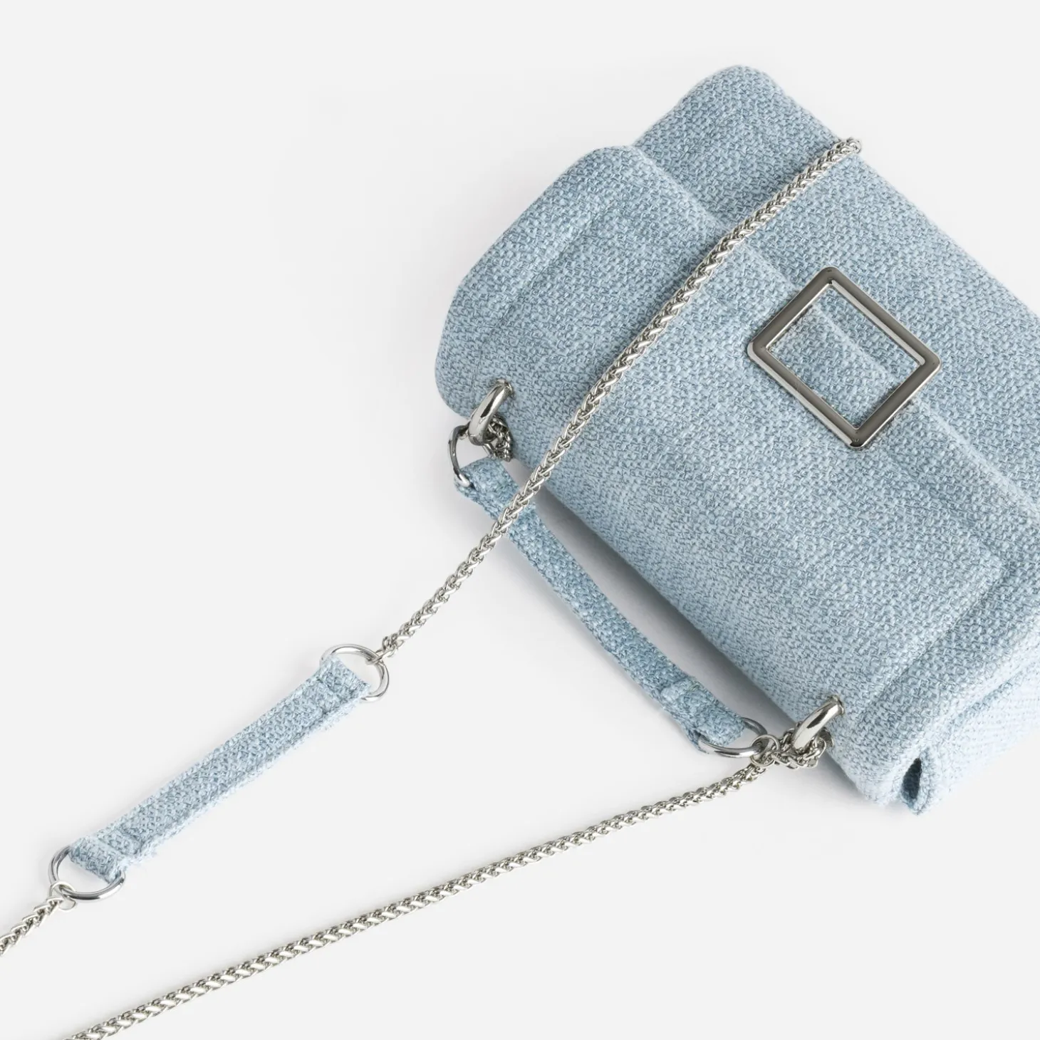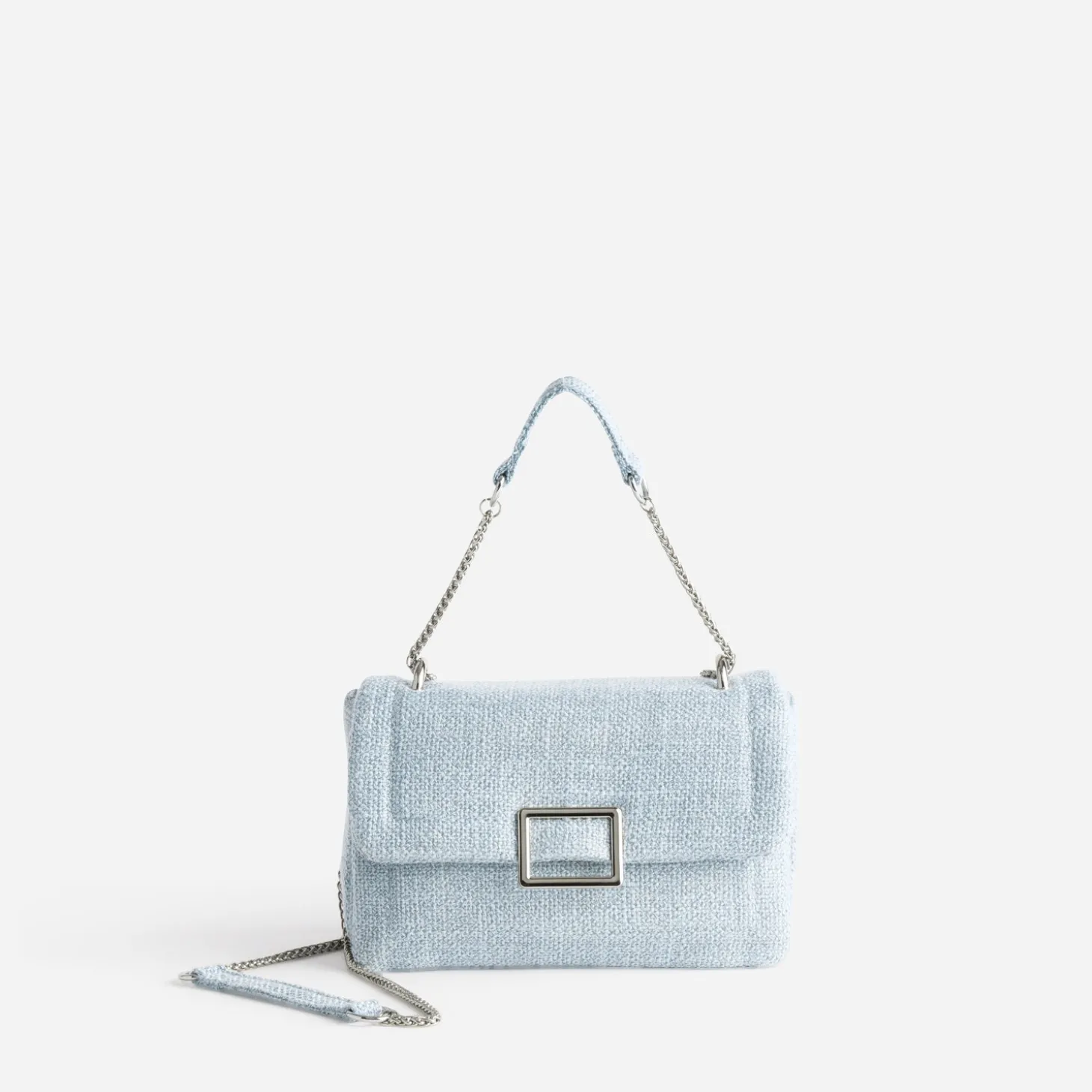 L’esprit Couture, c’est quoi ? C’est l’assurance d’un style raffiné, élégant, qui défie l’air du temps. C’est un sac à main en textile façon tweed, de couleur pastel, ici un bleu ciel, dessiné dans une forme boîte rigide. Sous le rabat pressionné, deux compartiments accueillent vos effets personnels, avec trois poches externes et internes, zippées ou non. La bandoulière joue le bi-matière, et coulisse pour un porté simple et long, ou double et plus court. Les métalleries prennent l’option gris argenté. Un modèle aux tons froids, à privilégier avec une robe longue en voile de couleur tendre, ou à décaler avec un total look denim bleu.