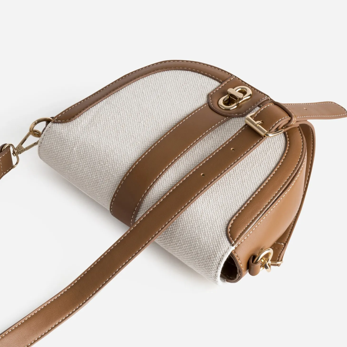 L’élégance du jeu de matières. La sobriété des couleurs. Ce sac à main à l’allure d’un grand, malgré son format moyen, pensé pour le quotidien. Mix de textile et de matière synthétique lisse, il associe le beige au camel, avec des surpiqûres contrastées, le tout rehaussé de métalleries dorées. Le compartiment principal accueille deux poches internes, dont une zippée, et se ferme par un système de tourniquet. La bandoulière est amovible et réglable, pour un porté épaule ou croisé. Un modèle intemporel, fait pour durer.