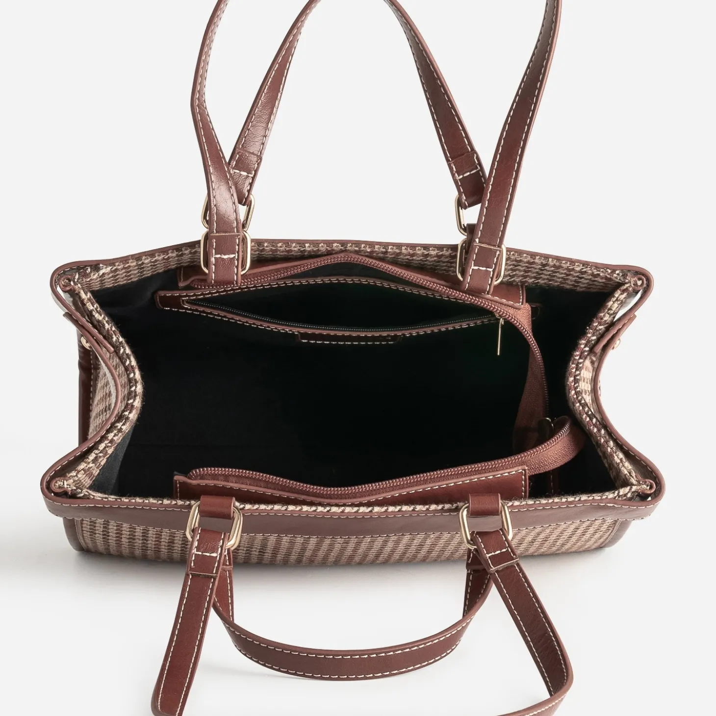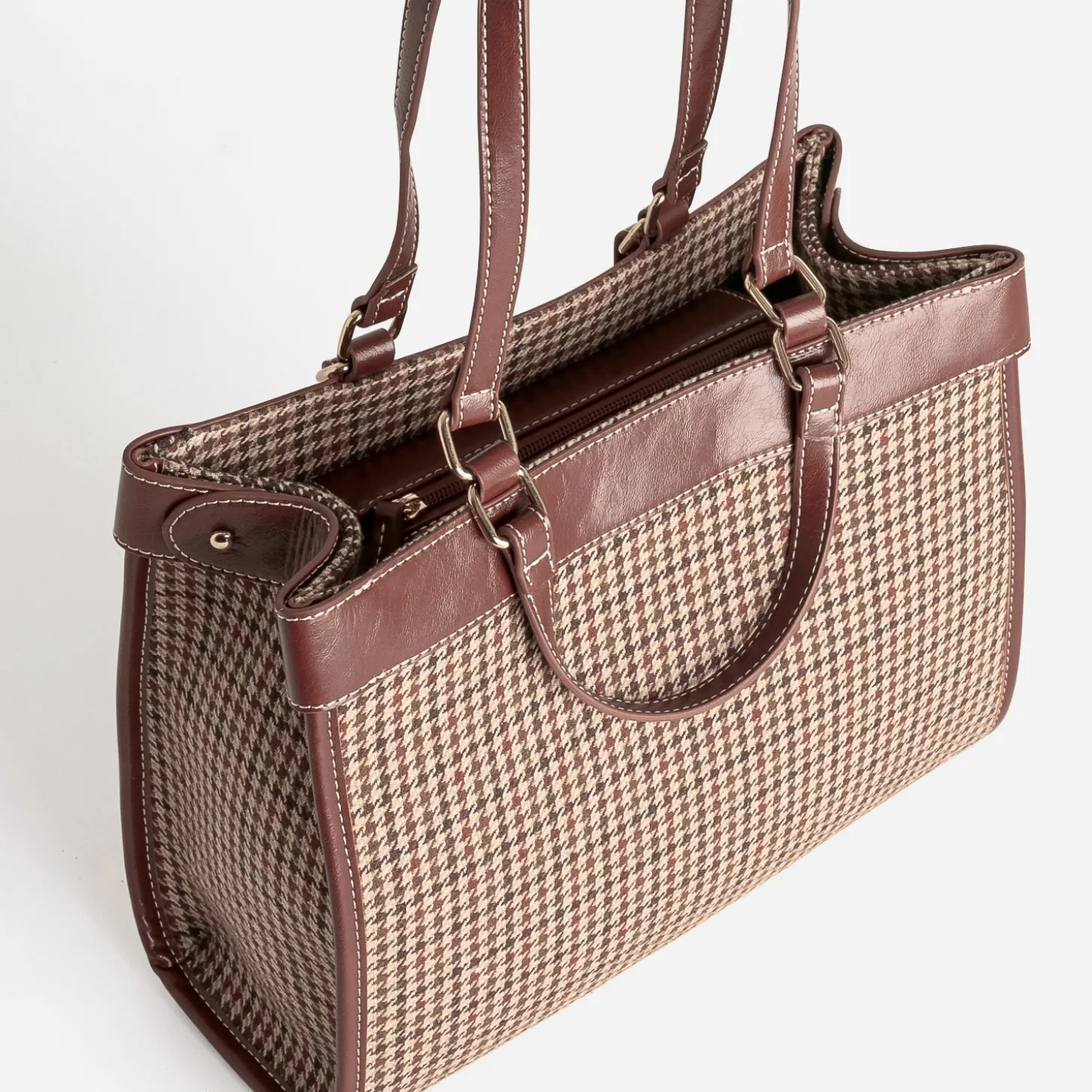 Sac à main cognac à motif pied-de-poule