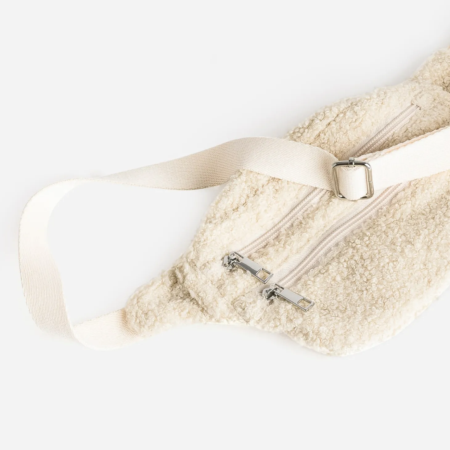 Le it-bag du moment, c’est le sac-banane ! En bouclette écrue, il se porte croisé sur le buste, pour laisser entière liberté aux mouvements. Devant, deux poches zippées accueillent tous les trésors. Un accessoire à réserver aux filles stylées.