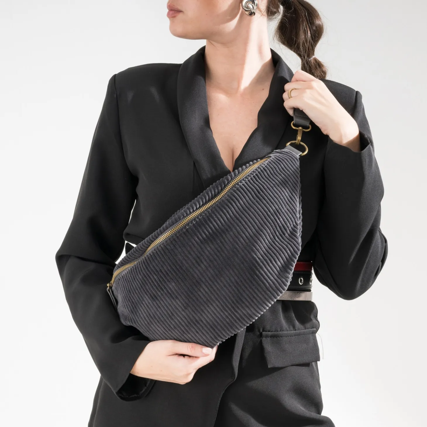 Sac banane gris velours côtelé