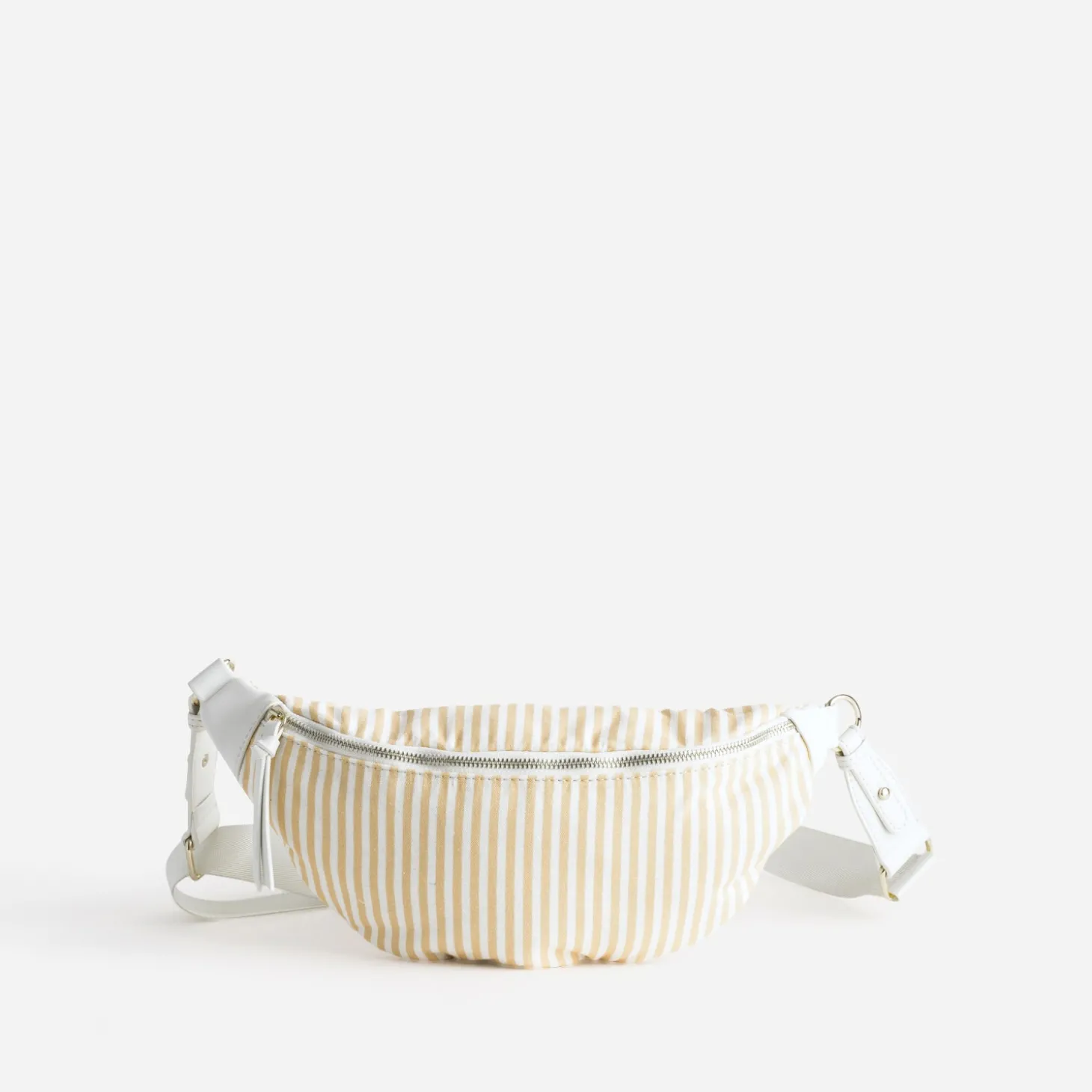 On ne vous apprendra rien en vous confiant que le sac-banane est, à nouveau, le it-bag de la saison. En textile écru, il s’inspire du bord de mer, du sud, des couleurs estivales, avec un motif rayures jaune orangé sur fond écru. La large bandoulière s’ajuste en fonction de votre buste, pour éviter de compromettre vos mouvements. Un modèle à adopter, sur un débardeur blanc, un short en jean bleu et une paire de tennis, de tongs ou d’espadrilles.
