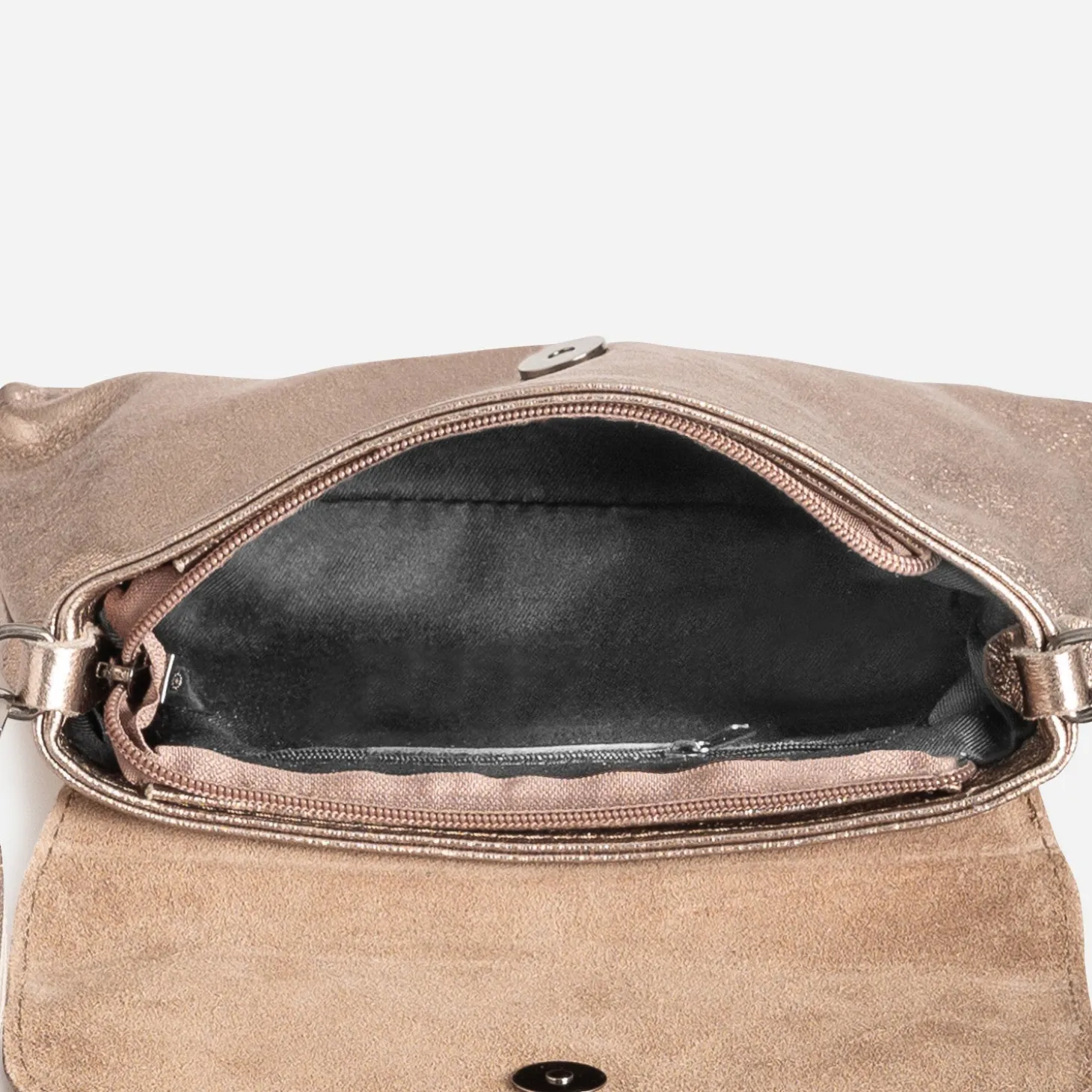 Vous êtes une femme brillante ? Votre sac, aussi ! En cuir métallisé bronze, ce sac à main opte pour un petit format légèrement trapèze, avec bandoulière assortie, réglable et amovible. Parfaitement sécurisé, il se ferme par un zip et un rabat aimanté. Un accessoire à porter sur l’épaule ou croisé sur le buste, pour garder la pleine disponibilité de vos mouvements.