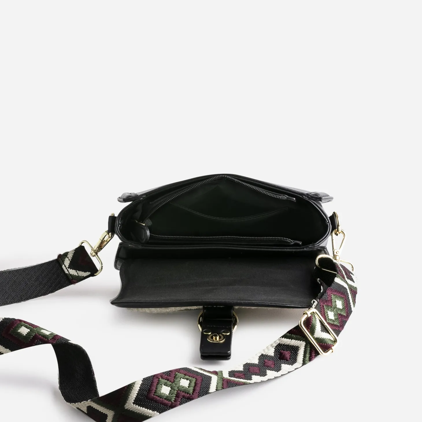 L’hiver appelle des matières plus douces, plus chaleureuses. Optez pour un sac à main de saison, en matière synthétique noire, rehaussée d’un rabat recouvert de tissu Sherpa beige. Il se porte soit sur l’épaule, soit croisé, grâce à une large bandoulière tissée à motif ethnique, ajustable et amovible. Un modèle à associer avec un look dans les mêmes tons.