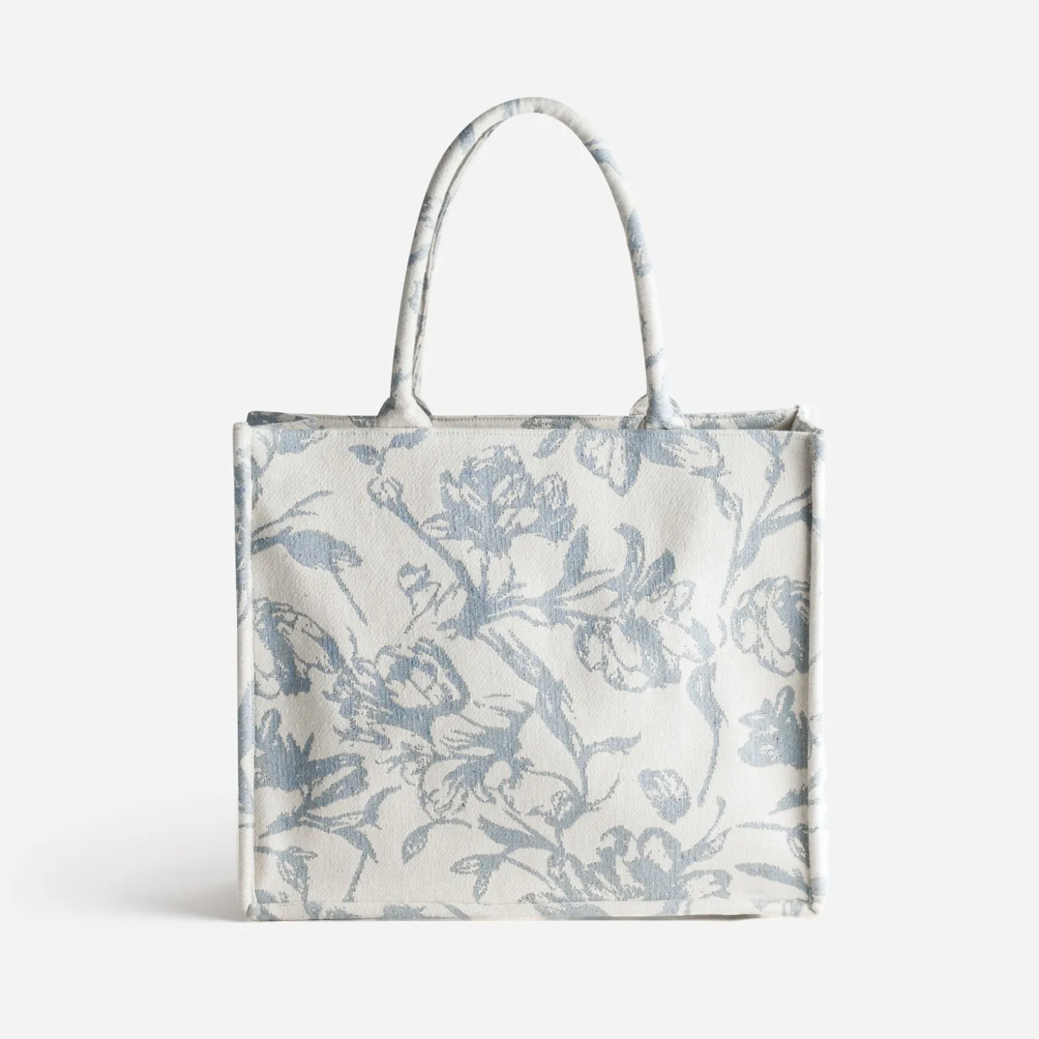 Les accessoires, aussi, varient en fonction des saisons. Le sac cabas s’offre un tissu jacquard beige, qui met à l’honneur un motif floral exclusif bleu ciel. Un modèle idéal au bureau, comme à la plage, pour transporter tous vos effets personnels.