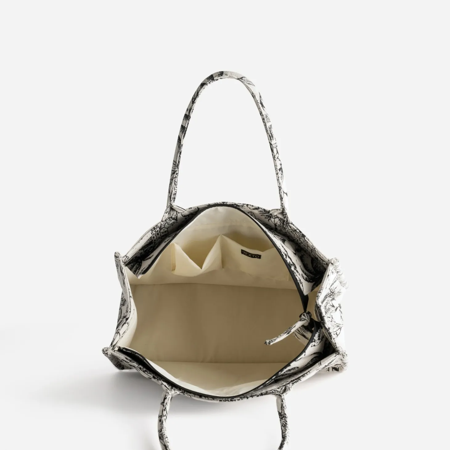 Voilà un cabas qui ne passe pas inaperçu. Imaginé pour contenir tous vos effets personnels, ce grand modèle est confectionné dans un tissu jacquard à motif villages, invitant oiseaux et feuillage, en coloris noir sur fond beige. Porté main ou épaule, il est idéal au quotidien. Le nouveau sac d’été à associer avec un look chic comme plus décontracté.