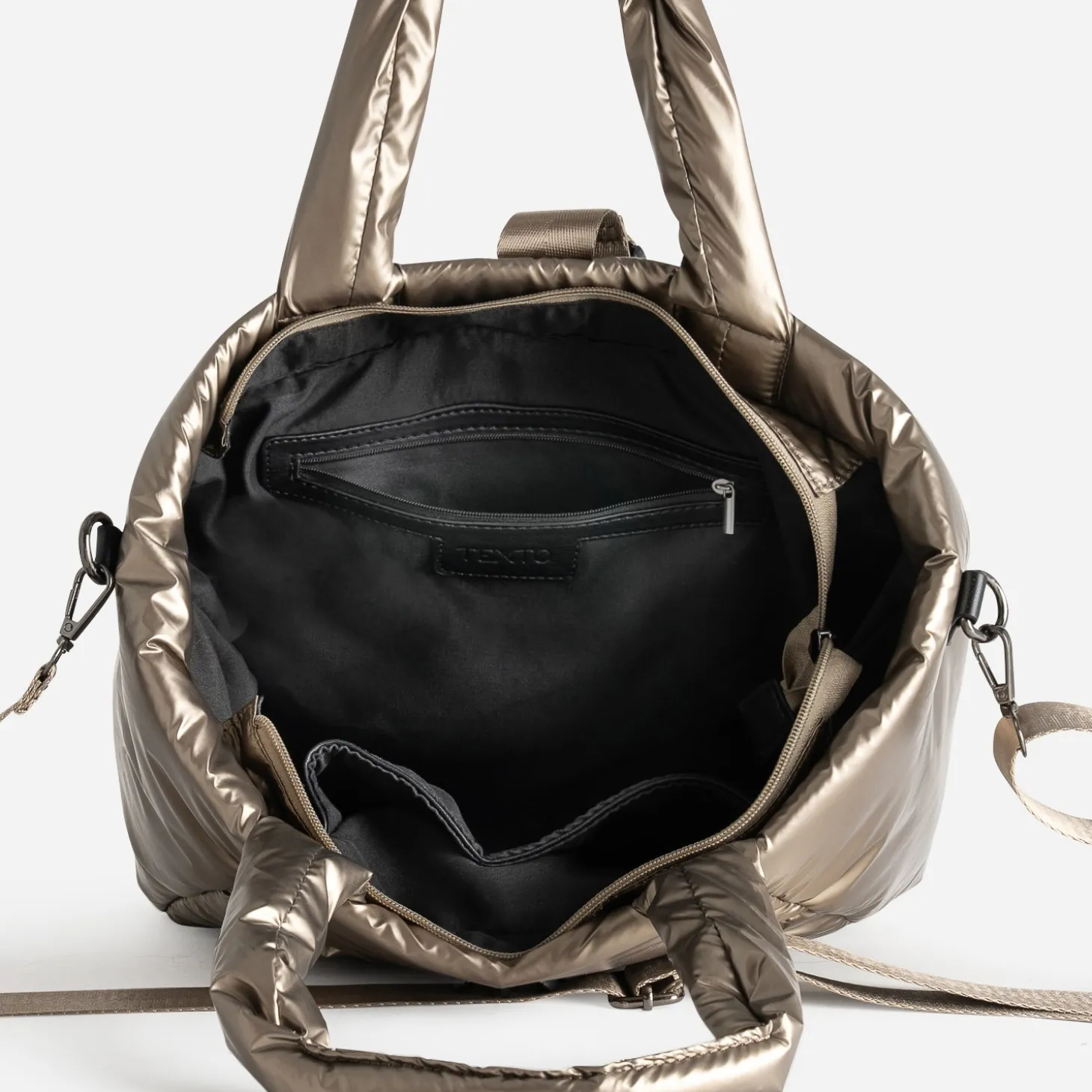 Si la doudoune revient dans le dressing à l’approche de l’hiver, le sac cabas y puise son inspiration cette saison. En nylon bronze, il lui copie son gonflant, jusqu’aux anses à poser sur l’épaule, et son matelassage spécifique. Il se ferme par un zip, doublé par un clip, emprunté au sac à dos. Un modèle casual, à préférer avec un look décontracté, sweat, jogging et sneakers en tête.