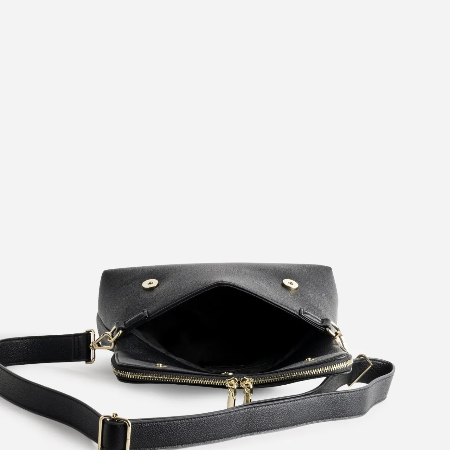 Tour de magie en action ! Ce sac à main pour femme crée la surprise, par une forme trapèze s’ouvrant, en hauteur, sur un grand compartiment fermé par un double curseur et qui se replie sur le devant, comme un rabat aimanté. A l’intérieur, la poche zippée permet d’isoler clés ou cartes. En matière synthétique grainée, il se décline en coloris noir, avec métalleries dorées. La bandoulière amovible et réglable permet d’ajuster le porté sur l’épaule ou croisé. Un accessoire fonctionnel et intemporel, pour vous accompagner au quotidien.