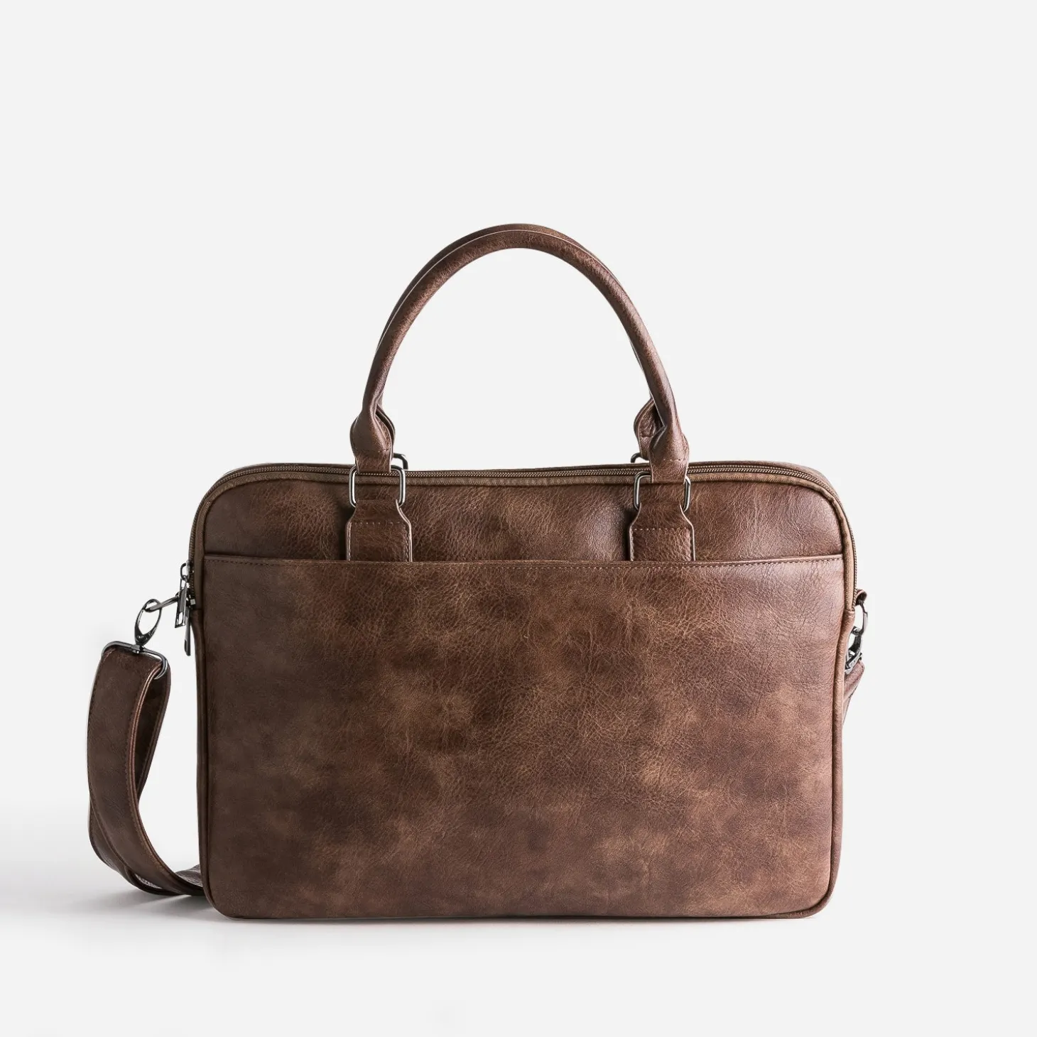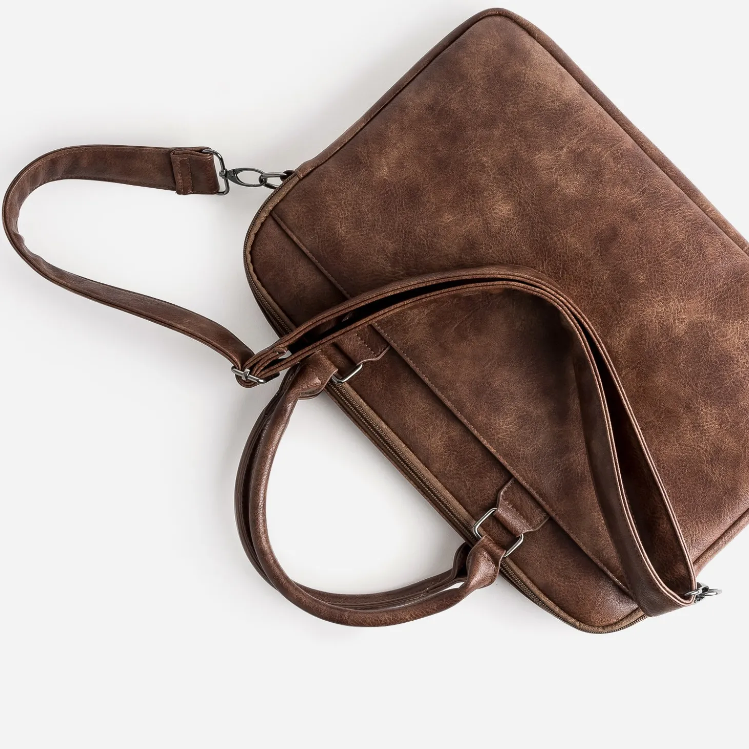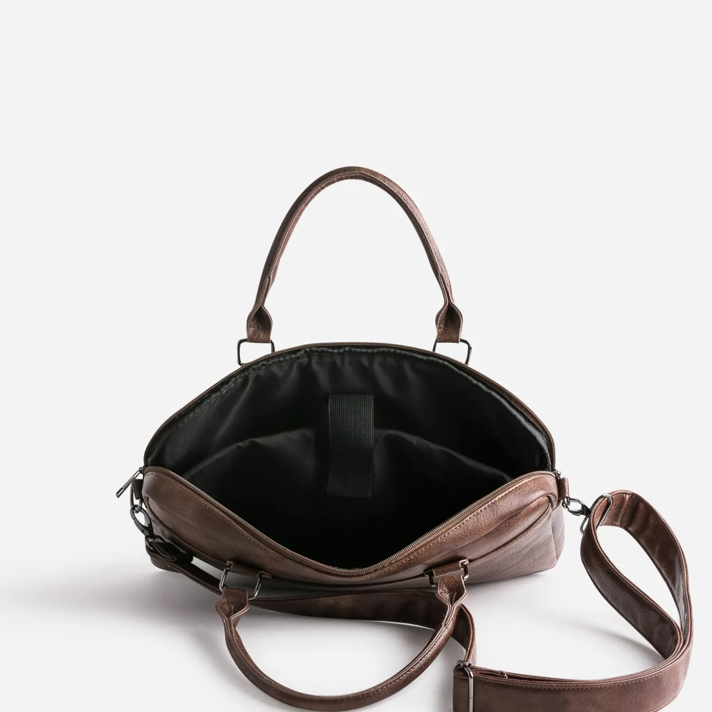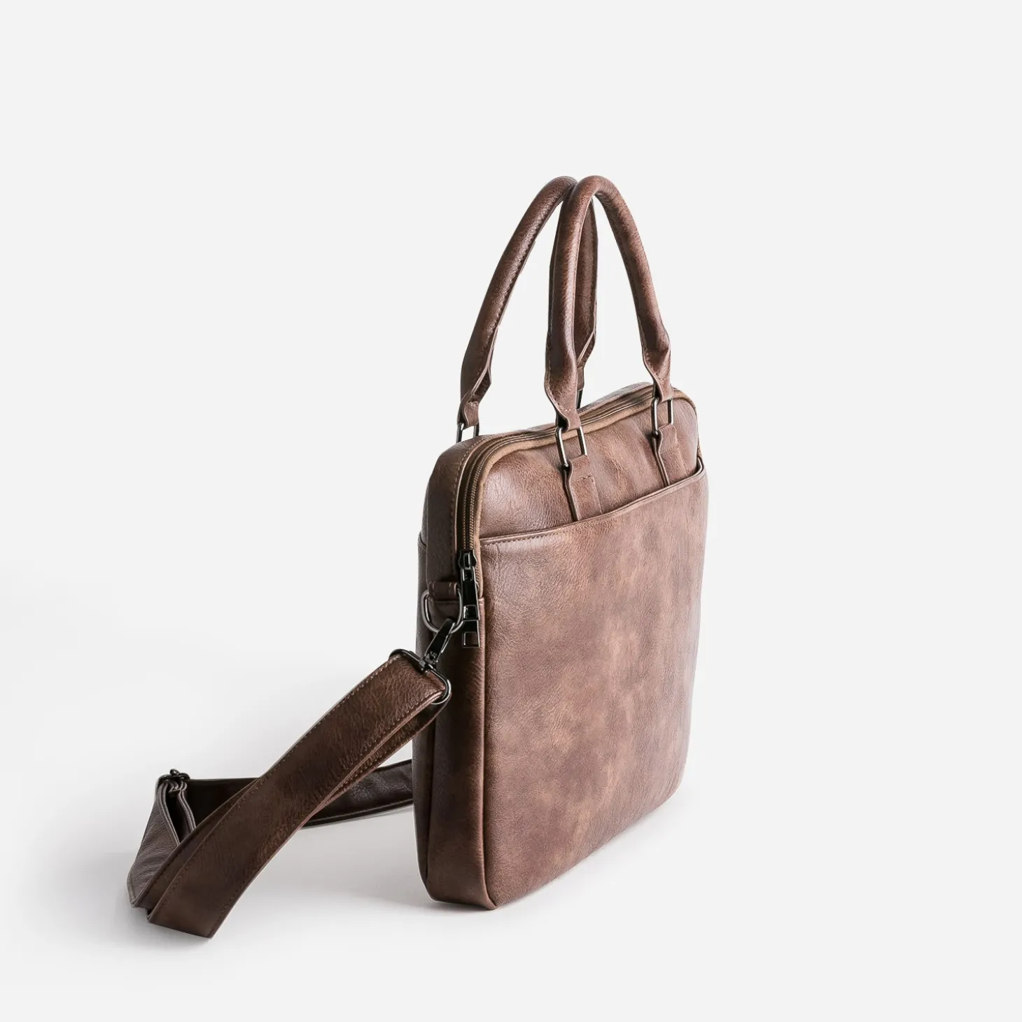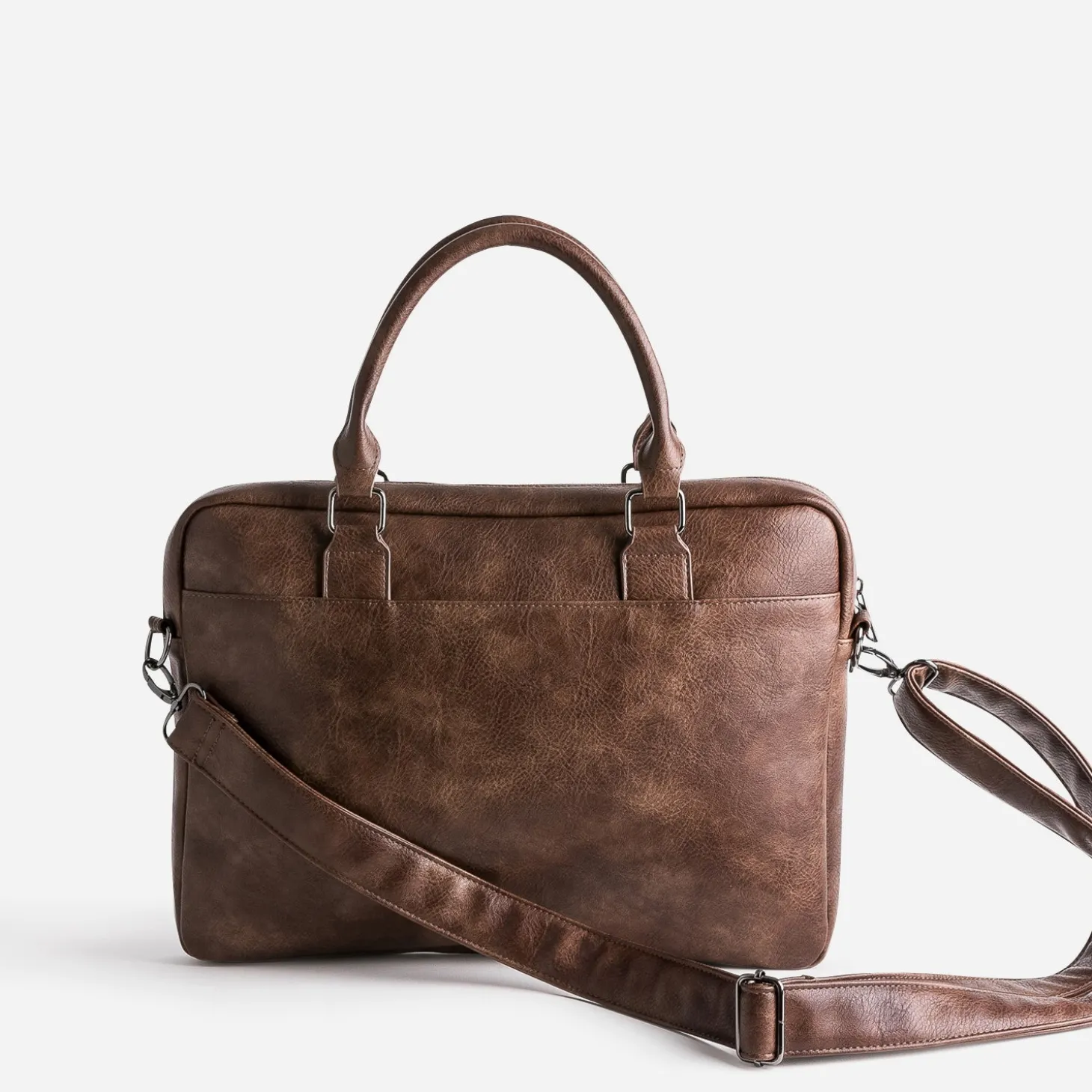 Vous cherchez un accessoire de maroquinerie adapté au transport de votre ordi et de vos documents professionnels ? Essayez cette sacoche, spécialement conçue pour ça, avec, à l’intérieur, un compartiment sécurité. En matière synthétique, elle se décline en coloris marron avec effet patiné.