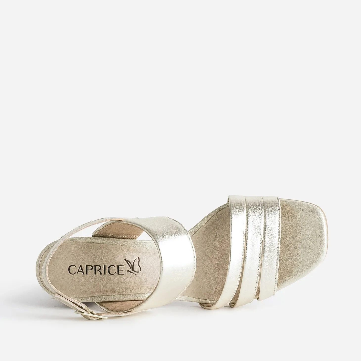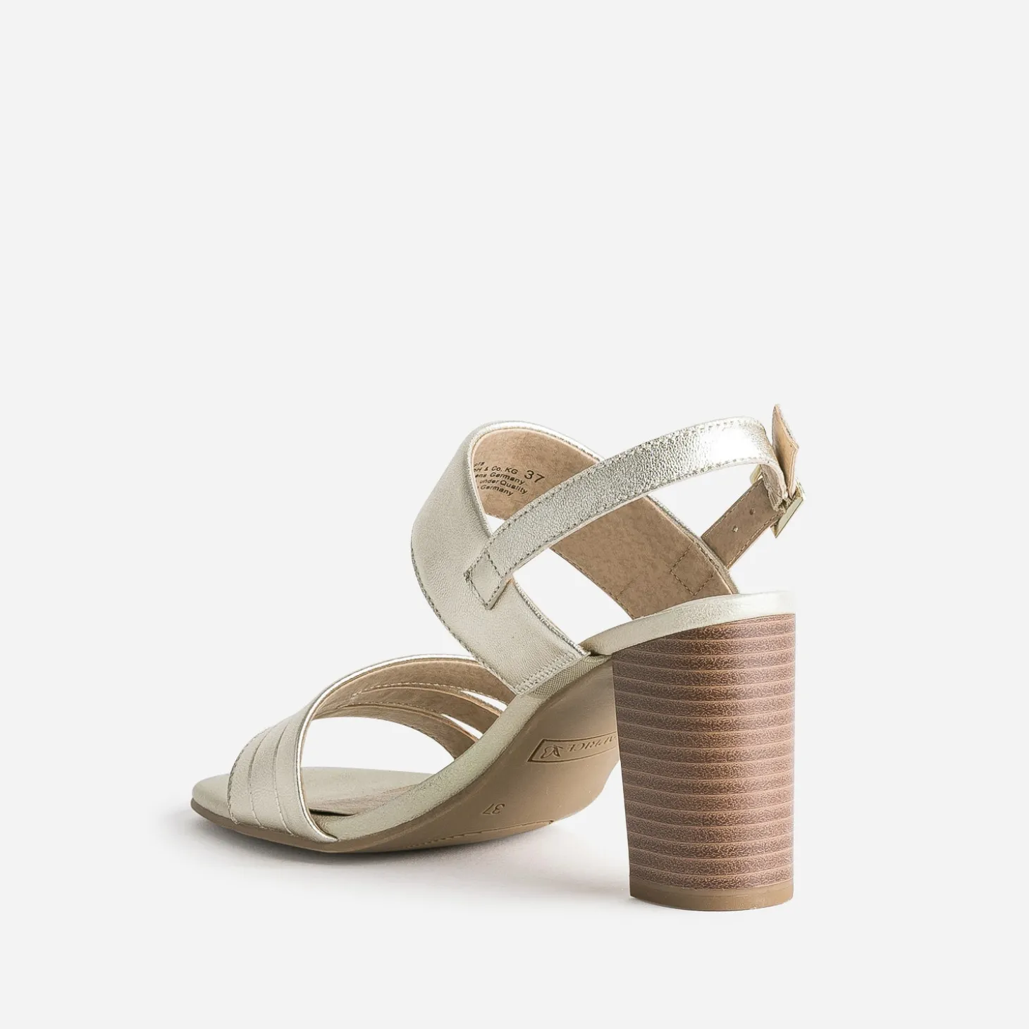 Et si vous vous laissiez surprendre par la sandale à talon ? Confectionnée en cuir lisse, elle se décline en coloris doré. Son talon de plus de 8 cm gagne résolument en confort grâce à une semelle moussée. Un modèle à réserver pour une belle occasion, avec, pourquoi pas, un tailleur-pantalon.