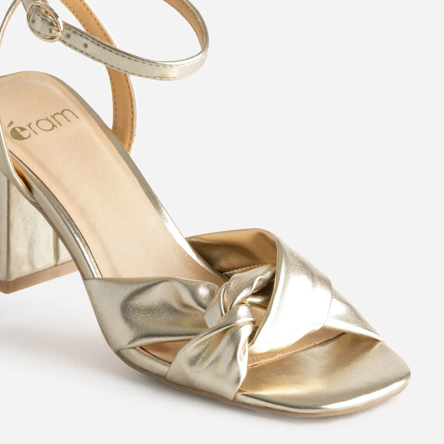 Il faut qu’ça brille ! ça pourrait être le dress code de votre prochaine cérémonie. Cette sandale femme l’a bien compris. En matière synthétique métallisée dorée, elle marque sa singularité par un jeu de brides souples nouées sur le dessus du pied et un talon carré recouvert. Un modèle qui fait l’unanimité, avec une robe blanche courte, à manches bouffantes et plastron volanté, pour une touche romantique à souhait.