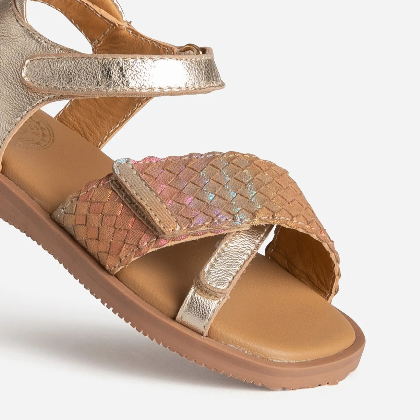 Cette sandale pour petite fille, c’est la garantie d’un look pétillant ! Les brides en cuir s’offrent une version métallisée dorée. Elles s’associent à une large bride tressée multicolore irisée, pour une touche de fun à chaque pas ; des brides facilement ajustables au pied, par un système de scratchs cachés. Un modèle très à l’aise avec une robe de cérémonie beige pailletée ou plus quotidien avec un tee-shirt blanc et un short en jean bleu.