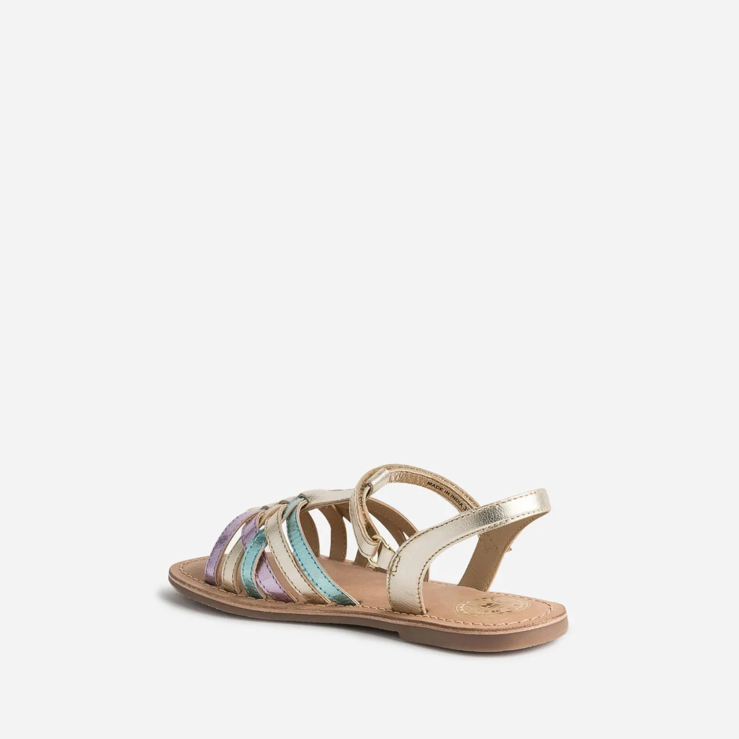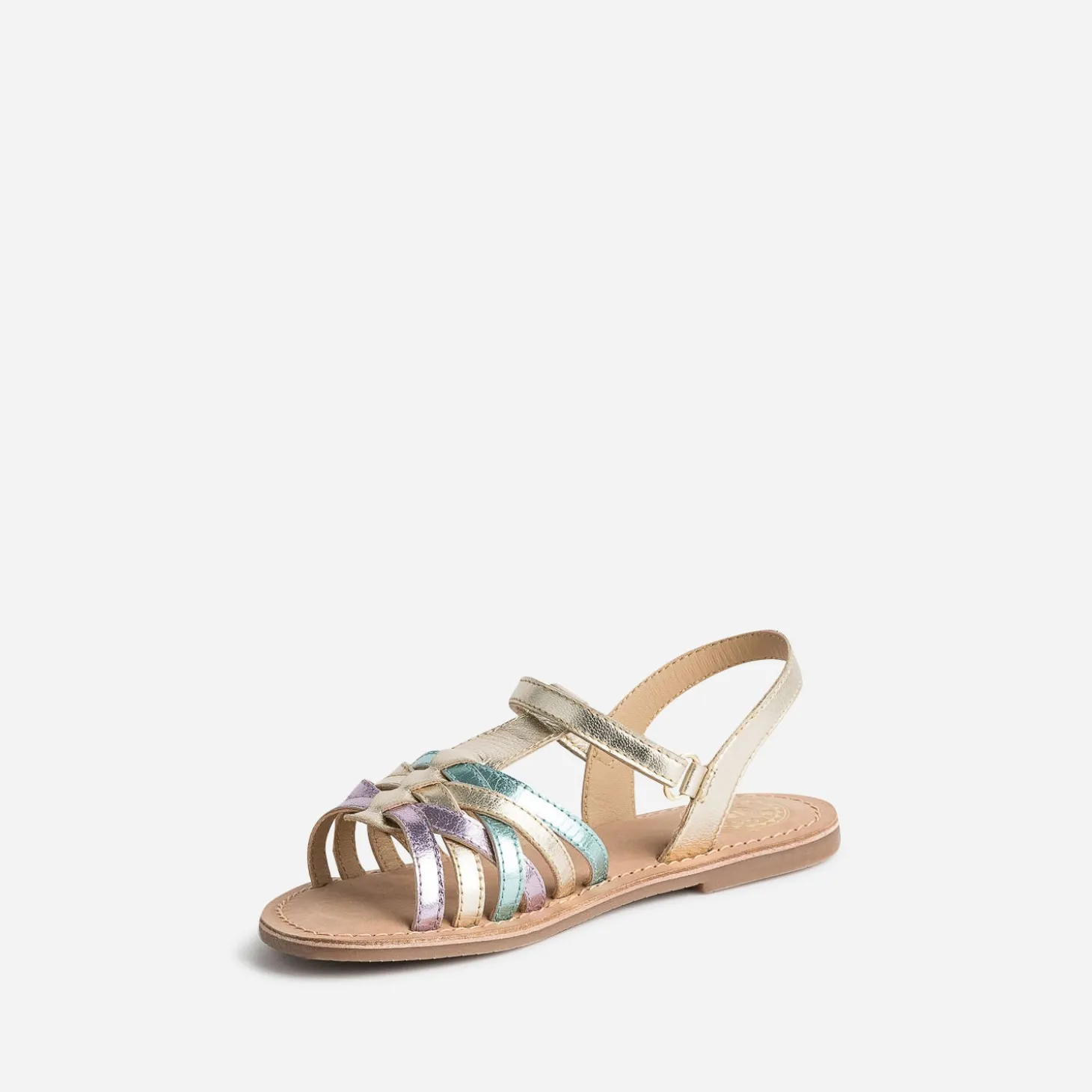 Le cuir métallisé a le pouvoir de sublimer chaque tenue d’une touche chic ; il habille cette sandale pour fille, dans les tons de doré, parme et vert, dans une belle harmonie. La fermeture par scratch facilite l’autonomie et permet ajustement, confort et maintien du pied. Un modèle à choisir pour une cérémonie, et à porter tout au long de la saison.