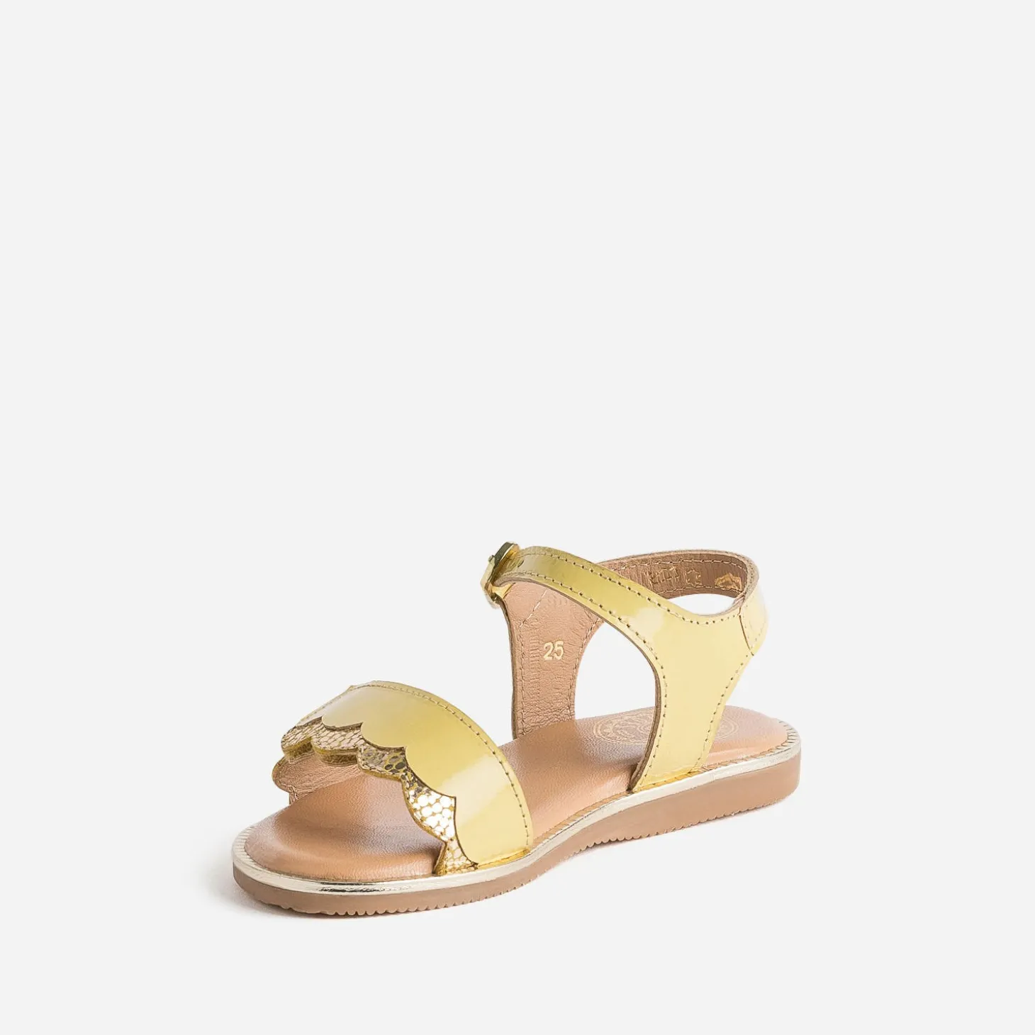 Vous cherchez le soleil ? Il est là. Juste à ses pieds. Dans une sandale en cuir jaune verni, bordé de doré, en écho à la trépointe. Sur la large bride, posée sur le dessus, des découpes vagues apportent un twist chic. Scratch et boucle s’associent pour maintenir parfaitement le pied. Un modèle à essayer avec un tee-shirt blanc et une robe salopette en jean bleu.