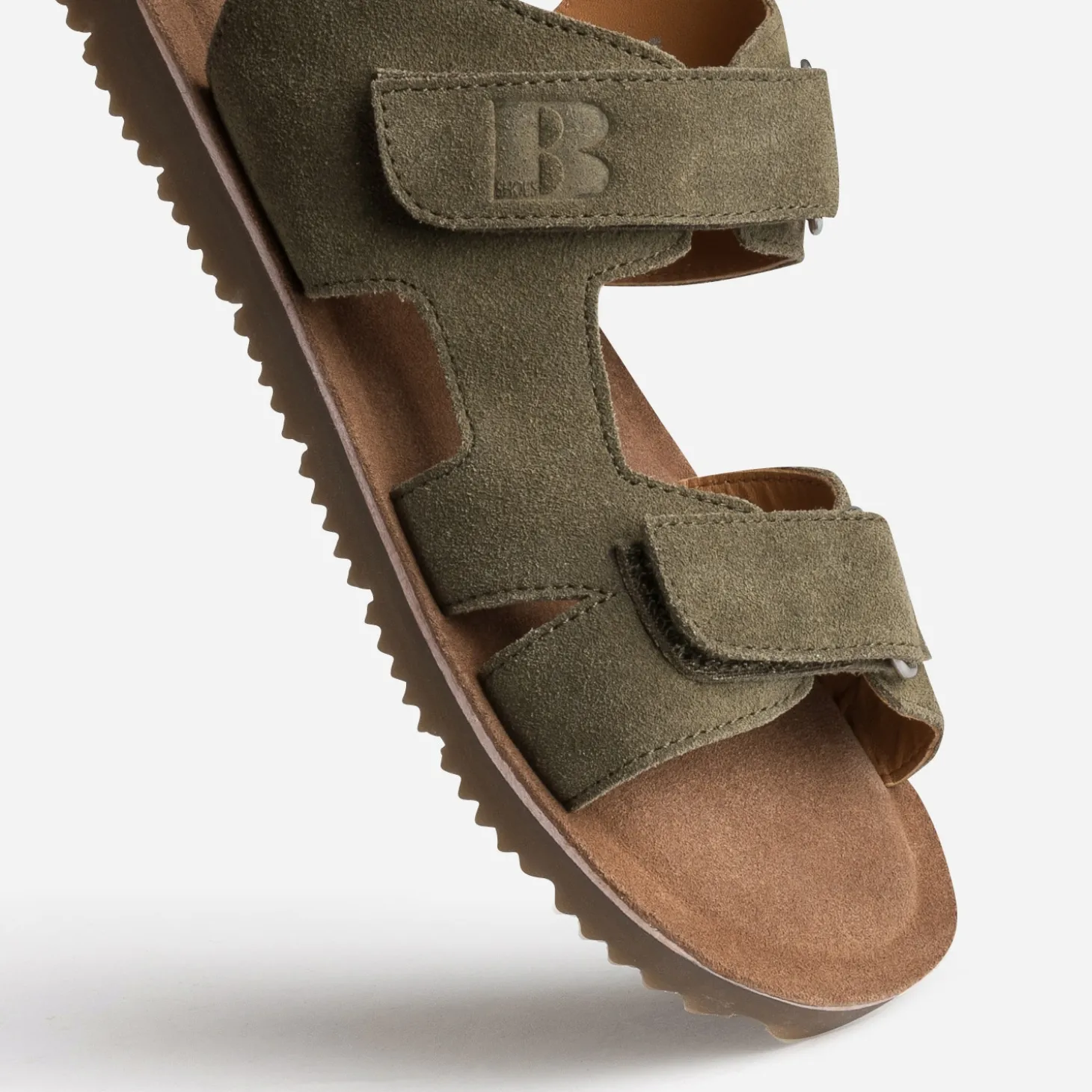 Le confort avant tout, même en sandale ! C’est le pari fou relevé par la marque Buggy, pour chausser les enfants. La tige en cuir velours avec doublure cuir et la semelle première en cuir velours accueillent le pied, grâce à deux scratchs et une bride matelassée. Son coloris kaki, twisté de marron, est parfaitement dans le ton de la saison.