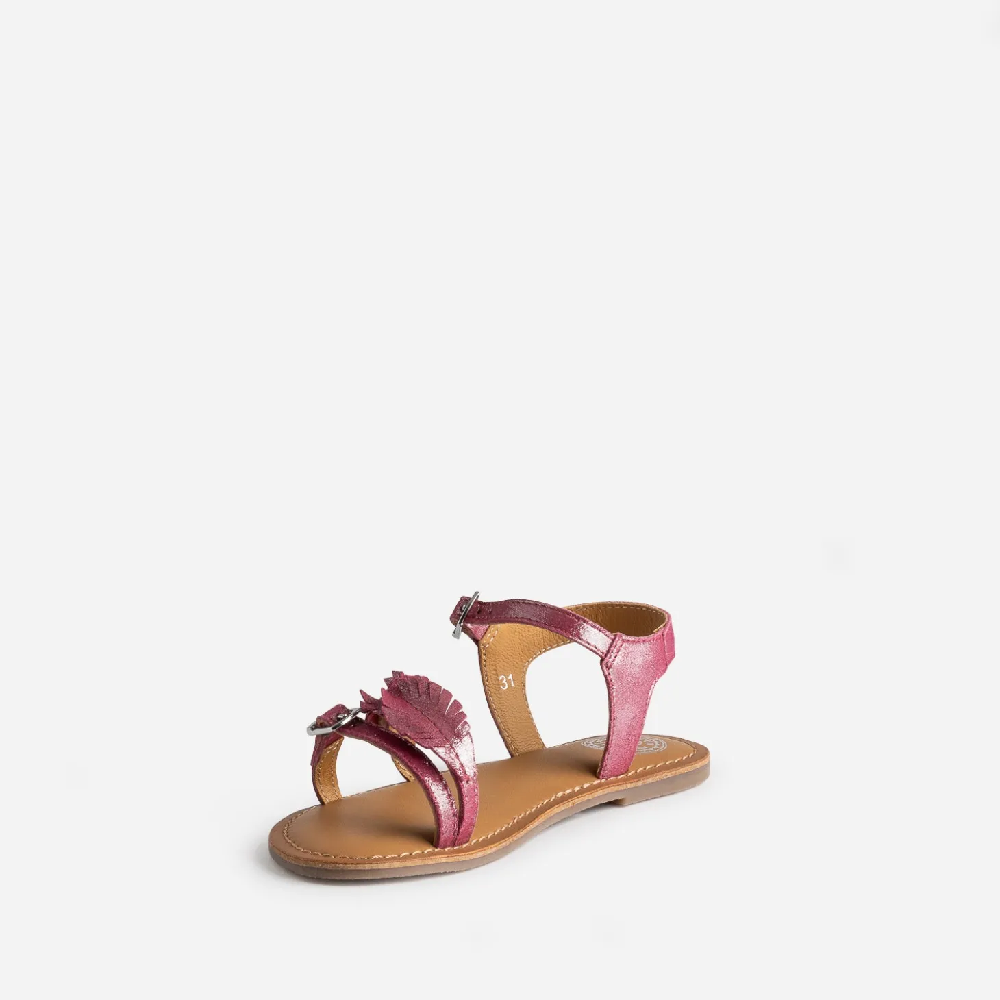 En cuir velours rose, avec finition irisée, cette sandale fille apporte une touche de couleur aux tenues. Construite avec 3 brides, elle est décorée d’une plume sur le dessus. Elle se ferme par boucles, à ajuster en fonction de la largeur du pied.