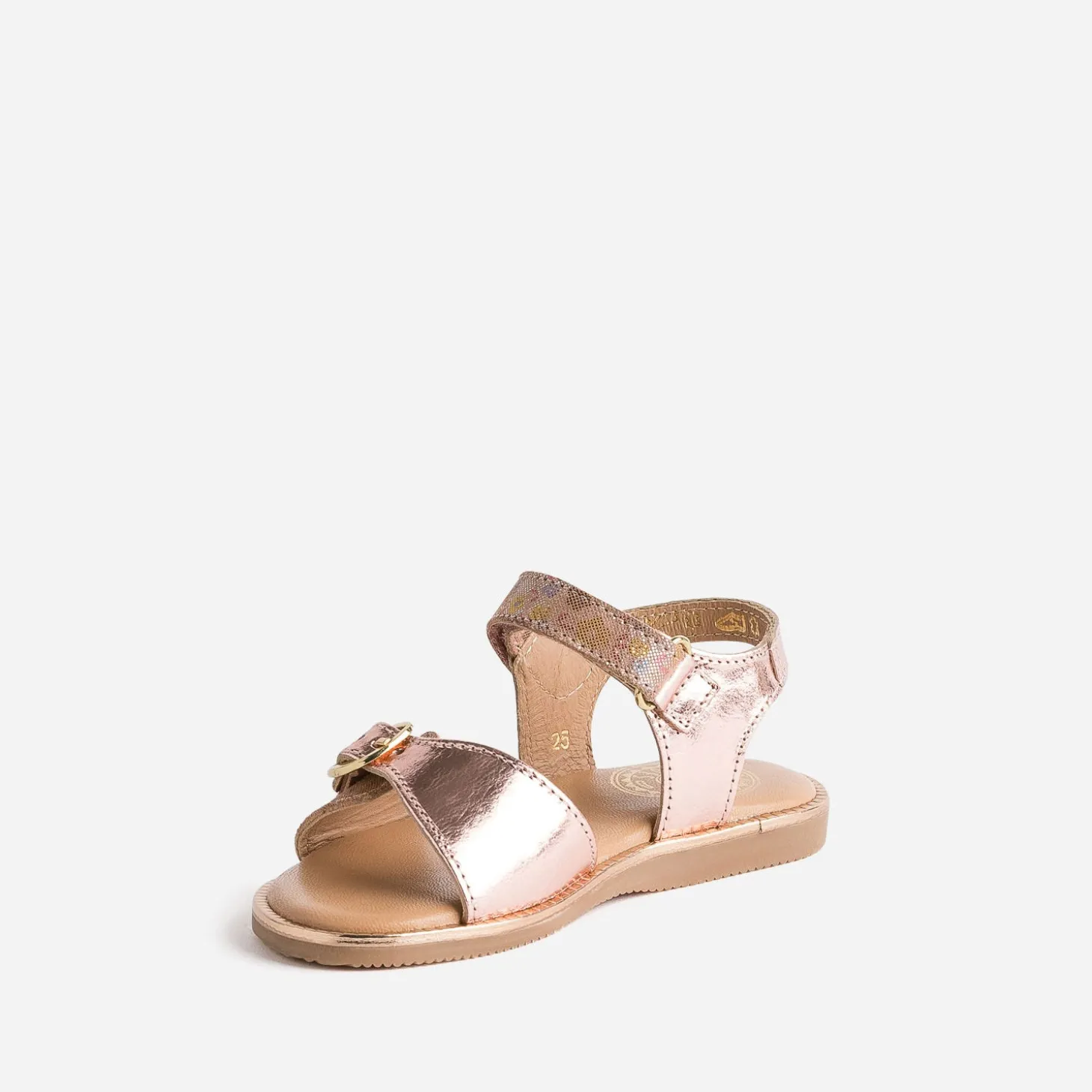 Rose cuivré avec finition métallisée et imprimé fleurs, la sandale pour petite fille a tout compris. Entièrement confectionnée en cuir, elle séduit aussi par ses détails : trépointe brillante, fermetures par boucle et scratch. Un modèle à essayer avec des couleurs pastel.