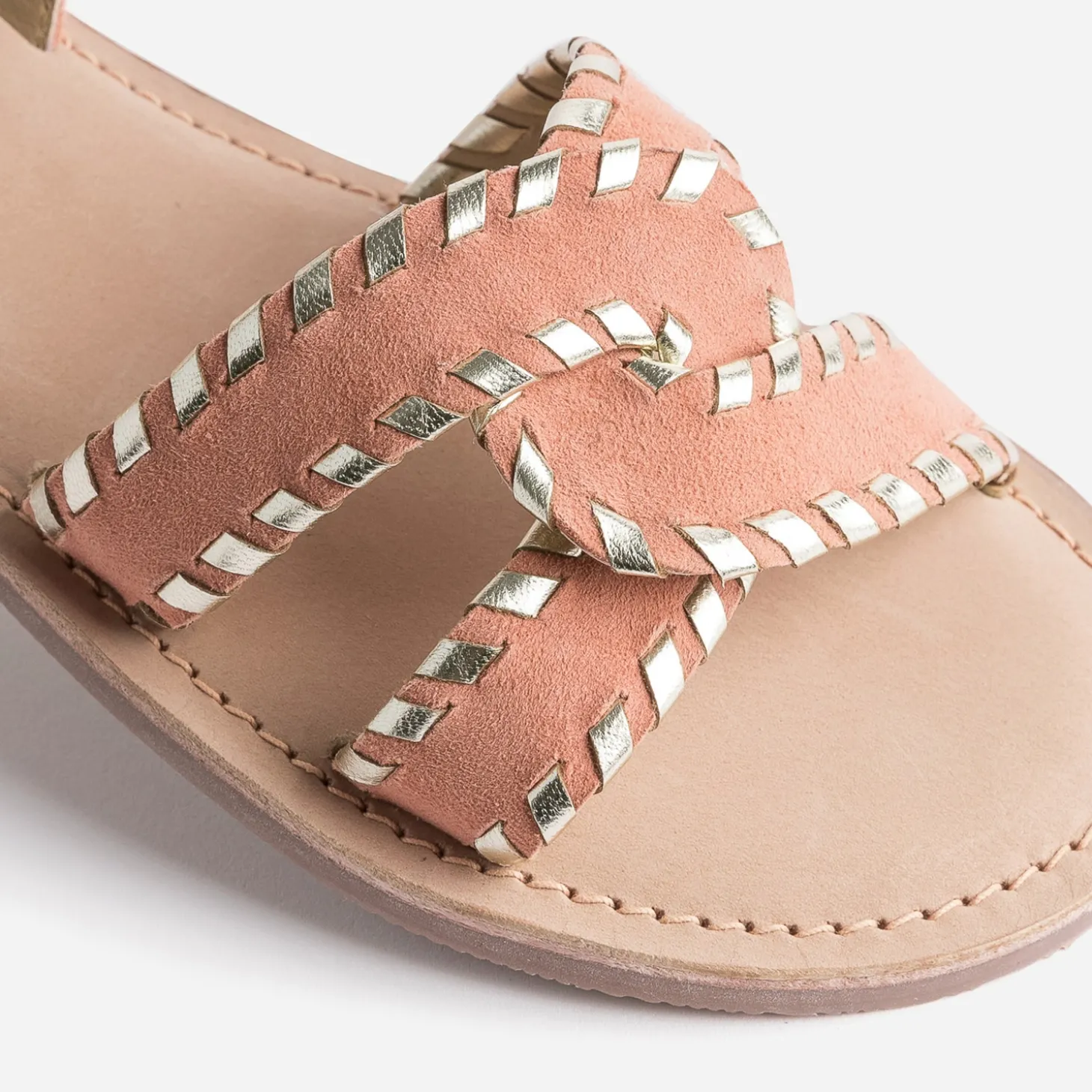 Cette sandale junior fille séduit par le cuir velours et le coloris rose saumon, par les brides croisées sur le dessus du pied et le tressage doré. Elle se ferme par un scratch, à ajuster en fonction du cou-de-pied. A associer avec des teintes pastel, amande, jaune ou ciel.